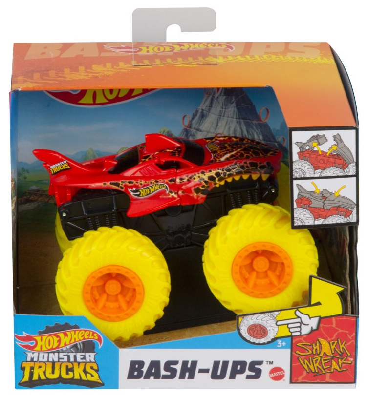 Autko Monster Trucks stworzone jest do prawdziwych akcji wyczynowych, rywalizacji i demolki! Pokonaj konkurencję za pomocą pojazdów w skali 1:43 Hot Wheels Monster Trucks z ogromnymi kołami. Kiedy pojazdy Monster Trucks Bash-Ups zderzają się lub uderzają w przeszkodę, otwierają się na trzy różne sposoby. Rozbij i złóż je, aby rozpocząć zabawę od nowa! Każde opakowanie zawiera informacje dotyczące danego Monster Trucka, obejmujące między innymi jego nazwę, typ i unikalny atak – aby odgrywanie przygód było jeszcze ciekawsze!