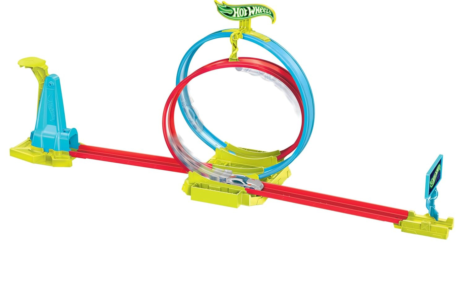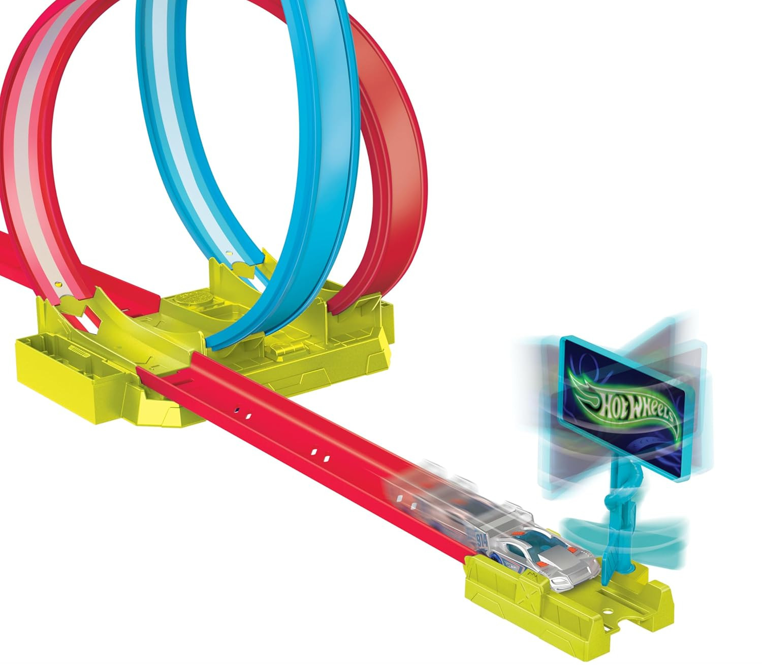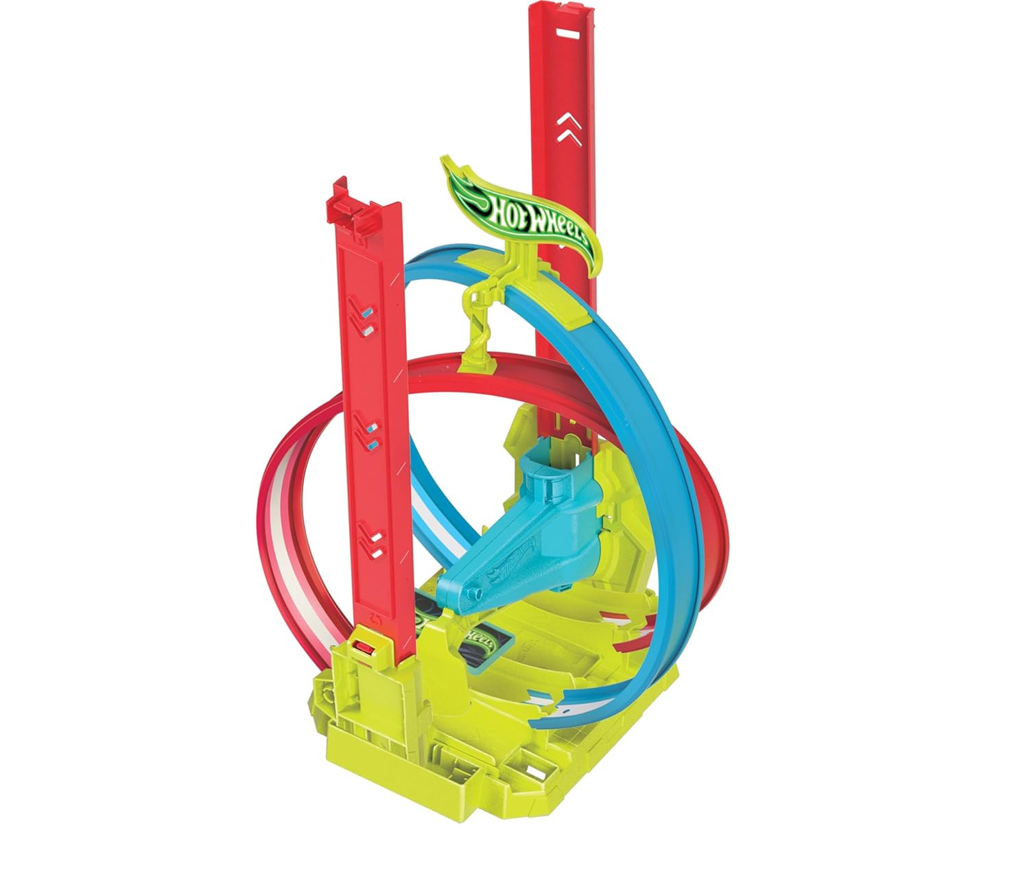 Wystrzel w podwójną odwróconą pętlę, a następnie ścigaj się przez linię mety toru Hot Wheels® Neonowa Superpętla. Ten neonowy zestaw ma billboard, który obraca się, gdy samochody przejeżdżają przez linię mety!
