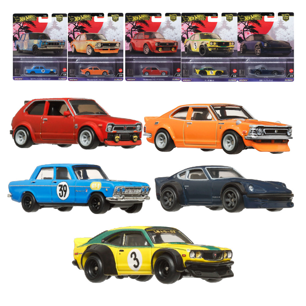 Hot Wheels Premium Car Culture Japan Historics Zestaw 5 Aut '73 Honda, '72 Toyota Corolla, '64 Prince Skyline,Nissan Fairlady Z, Mazda RX-3