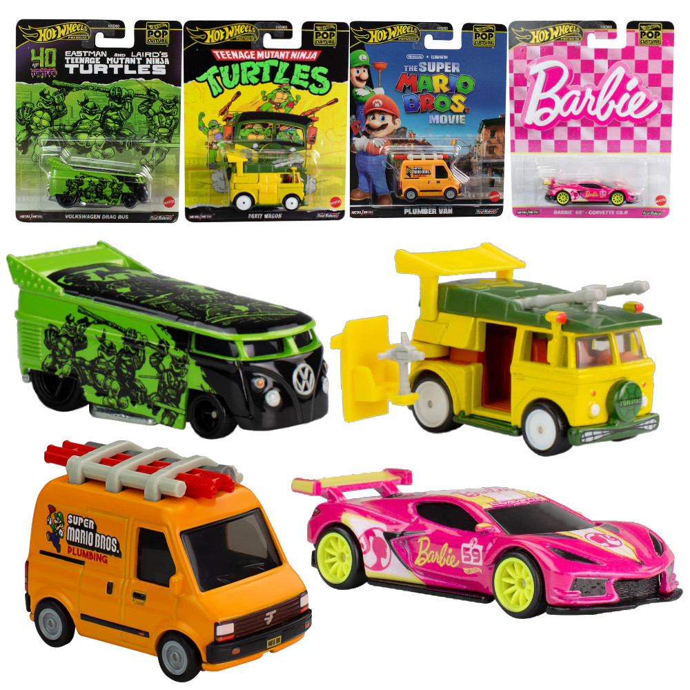 Hot Wheels Premium Pop Culture Zestaw 4 aut Żółwie Ninja Party Wagon i Volkswagen Drag Bus, Super Mario Bros Plumber Van, Barbie Corvette