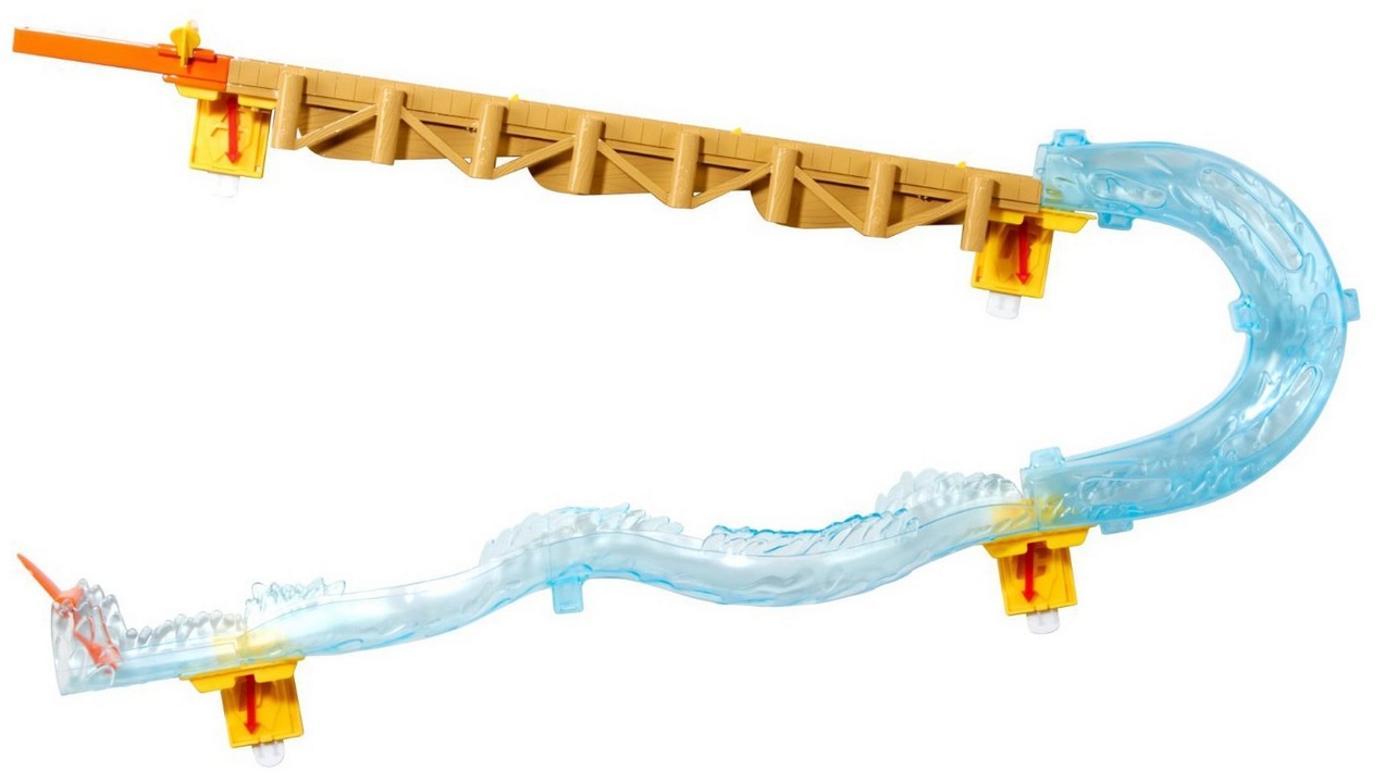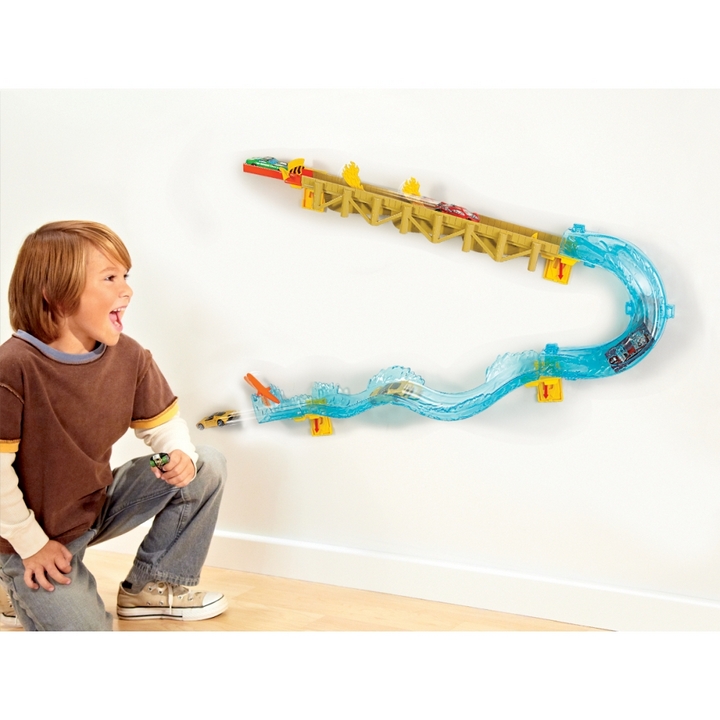 Czas oderwać tory od ziemi i zainstalować je na ścianie! Tory montuje się na ścianie przy użyciu specjalnych plastrów samoprzylepnych Command produkcji 3M, z możliwością demontażu bez uszkodzenia ściany. Boardwalk Blast to duży zestaw z drewnianym mostem i wodnym zjazdem. Auta nabierają prędkości zjeżdżając po drewnianym pomoście, a zaraz za nim nawrót i skoki na falach.