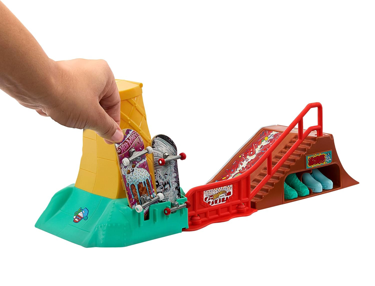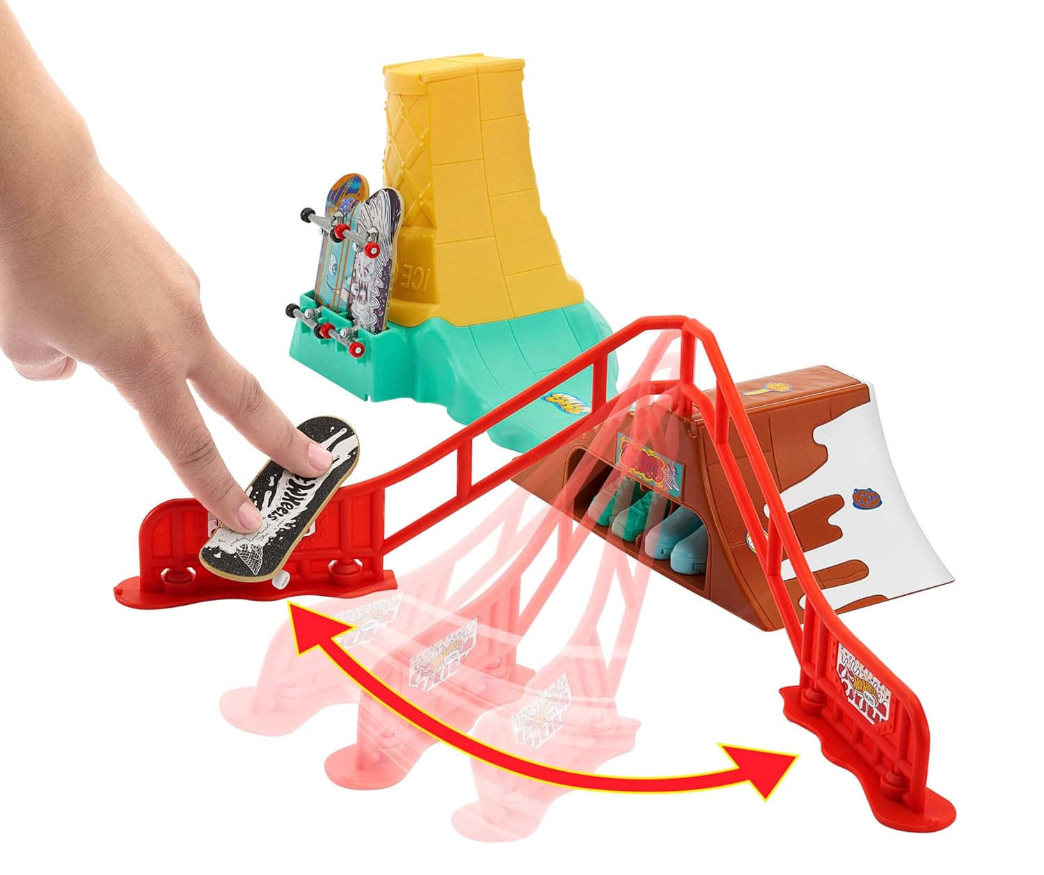 Wykonuj słodkie triki w Hot Wheels Skate Dessert Skate Park. Zjedź na deskorolce z odwróconego stożka lodów, wjedź na tort i szlifuj poręcz, urozmaicając każdy przejazd niesamowitymi saltami i trikami. Zestaw zawiera jedną ekskluzywną deskorolkę Hot Wheels Skate i parę zdejmowanych butów, a także wbudowany schowek na kolejną deskę i parę butów.