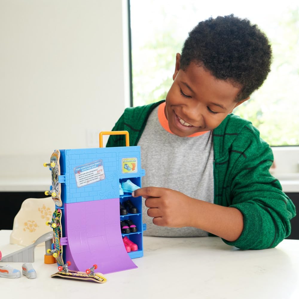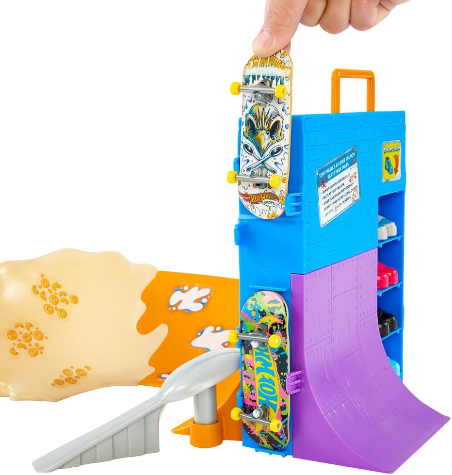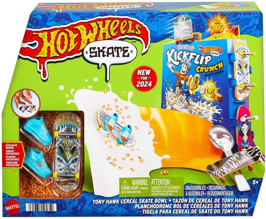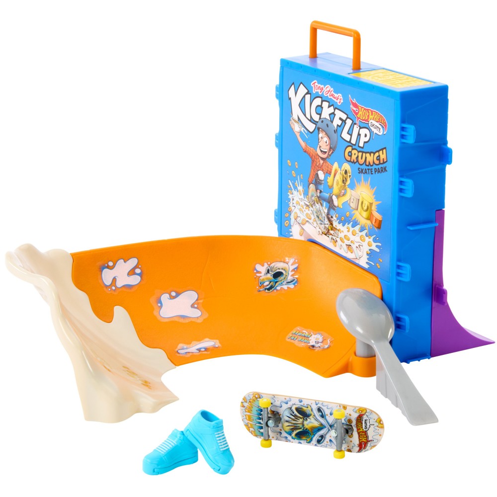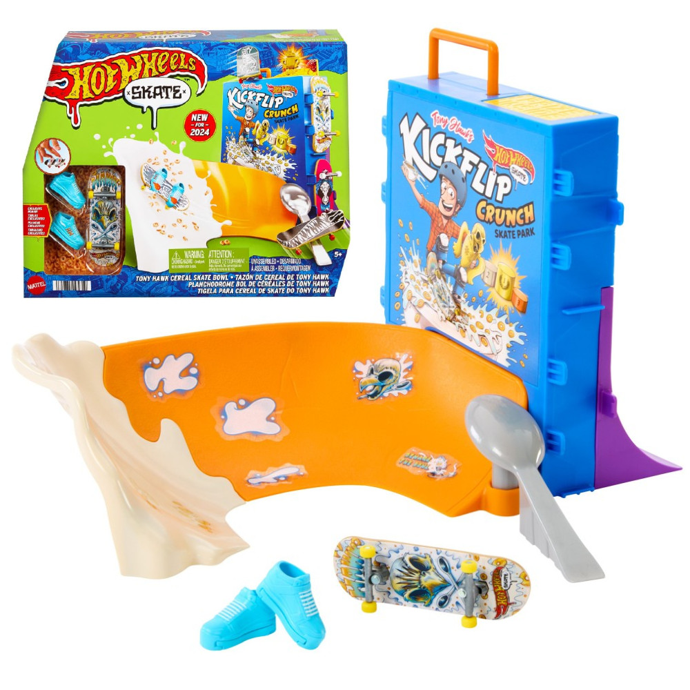 Dobrze zacznij dzień, szalejąc na desce od samego rana w zestawie Hot Wheels Skate Tony Hawk – Śniadaniowa rampa. Zestaw został zaprojektowany we współpracy z legendą skateboardingu, Tonym Hawkiem, i pozwala mistrzom deski śmigać po misce, robić sztuczki na pudełku „płatków”, a potem ślizgać się po poręczy na górze, aby odkryć trofeum. Pędź po tylnej rampie i poręczy w kształcie łyżki, aby popisać się ruchami zawodowca. W zestawie jest jedna wyjątkowa deskorolka do jazdy palcami i para butów deskorolkowych na palce, a także miejsce na cztery deski i cztery pary butów.