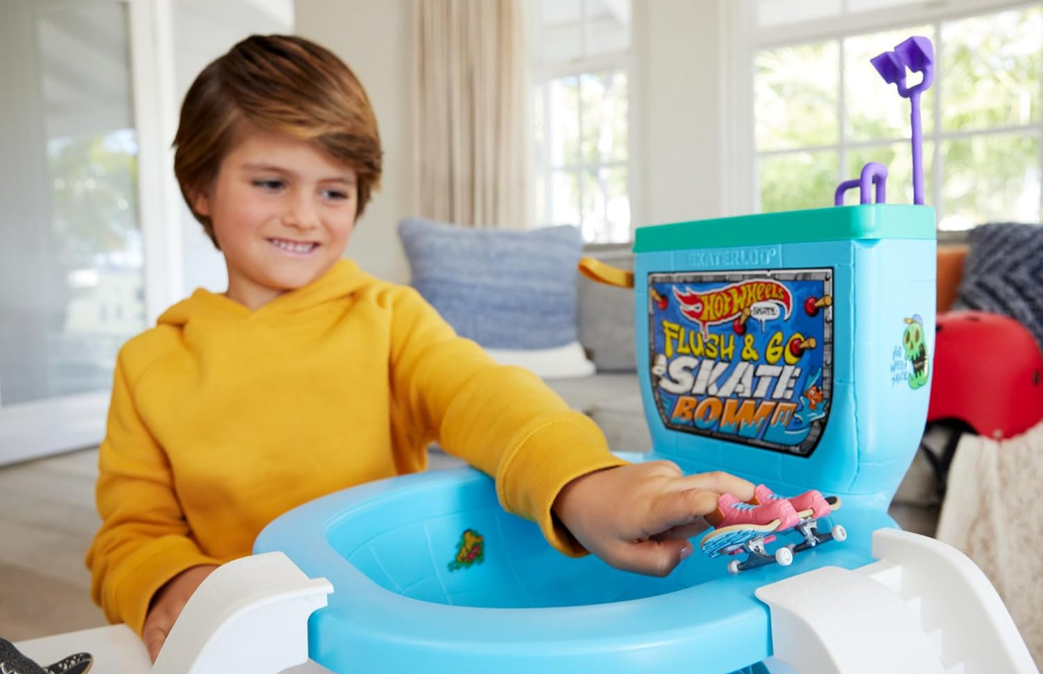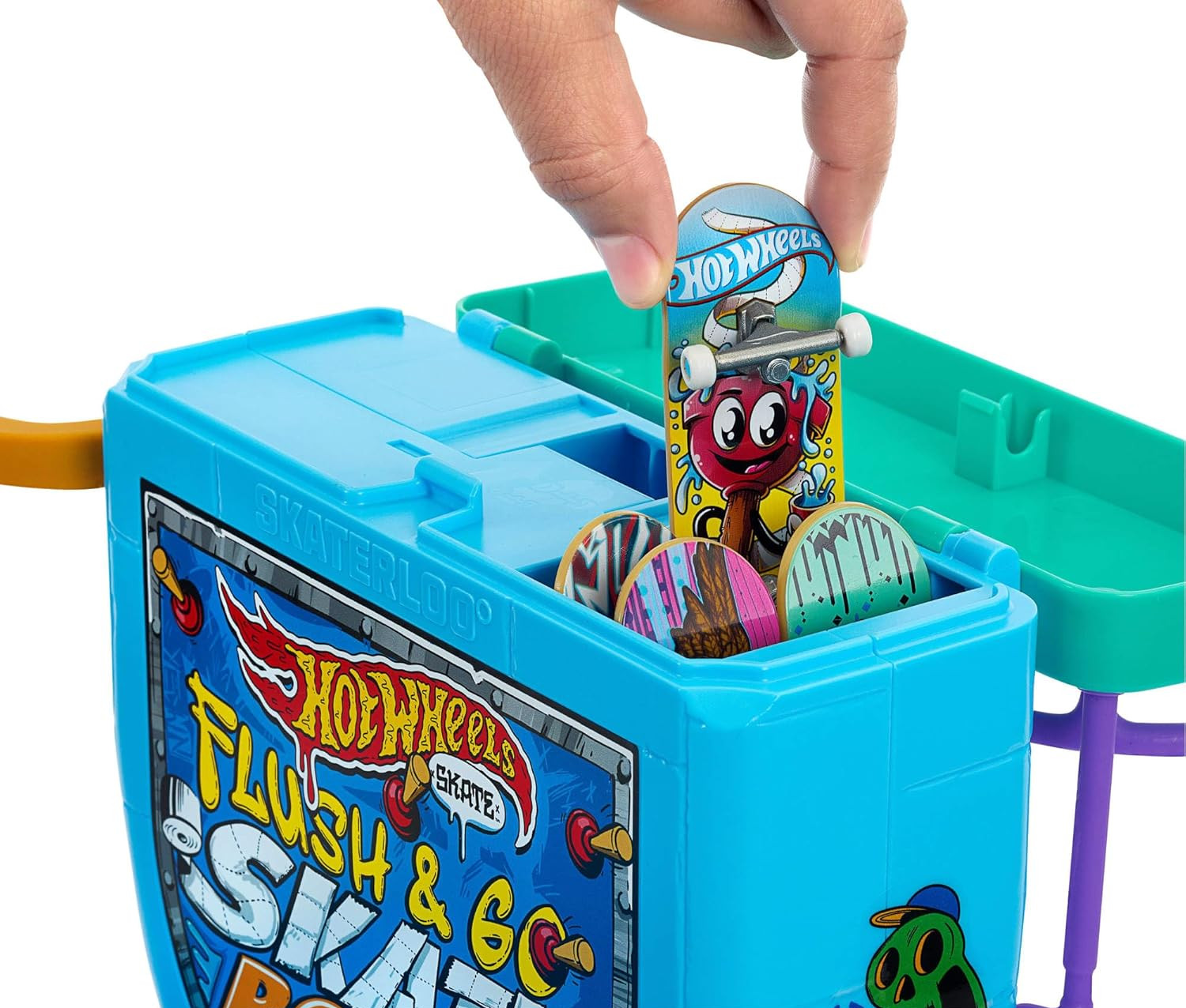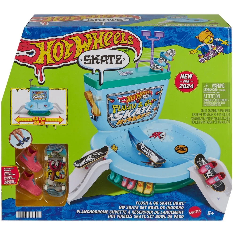 Naciśnij dźwignię na muszli klozetowej Hot Wheels Skate, aby spłukać deskę Hot Wheels Skate i rozpocząć jazdę! Zestaw zawiera niesamowite powierzchnie do jazdy na deskorolce, w tym masywną miskę, rampy z papieru toaletowego, tylną rampę i szynę do grindowania, a także miejsce na 4 fingerboardy i 6 par butów. W zestawie znajduje się jedna ekskluzywna deska oraz jedna para zdejmowanych butów do skateboardingu.
