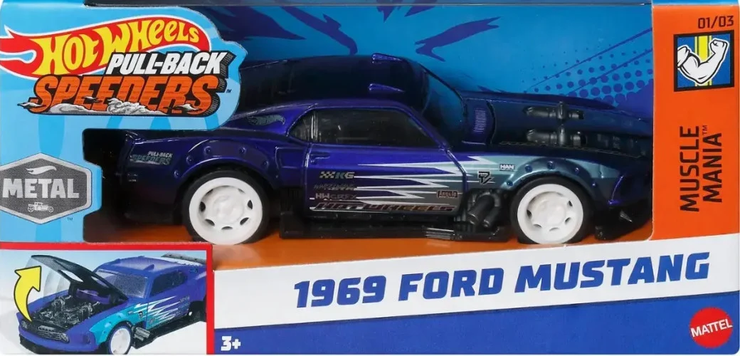 Model 1969 Ford Mustang z linii Hot Wheels to niezwykle szczegółowy pojazd w skali 1:43, który doskonale oddaje charakterystyki sportowego auta. Posiada niskie zawieszenie, niebieską karoserię oraz otwieraną maskę, co czyni go prawdziwą perełką kolekcjonerską. Należy do nowej serii Speeders i został wyposażony w napęd typu pull-back. Dzięki specjalnym sprężynom w tylnych kołach, wystarczy pociągnąć go do tyłu, by mógł przejechać ponad trzy metry.