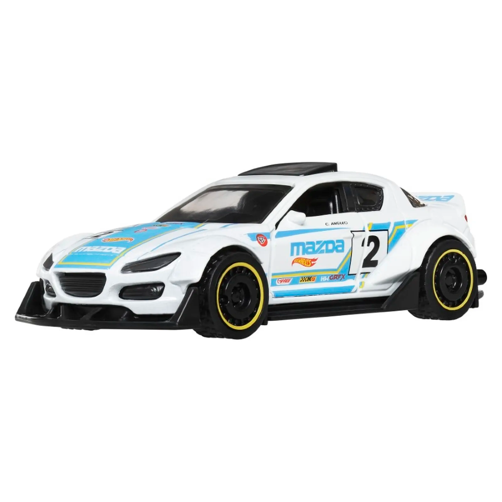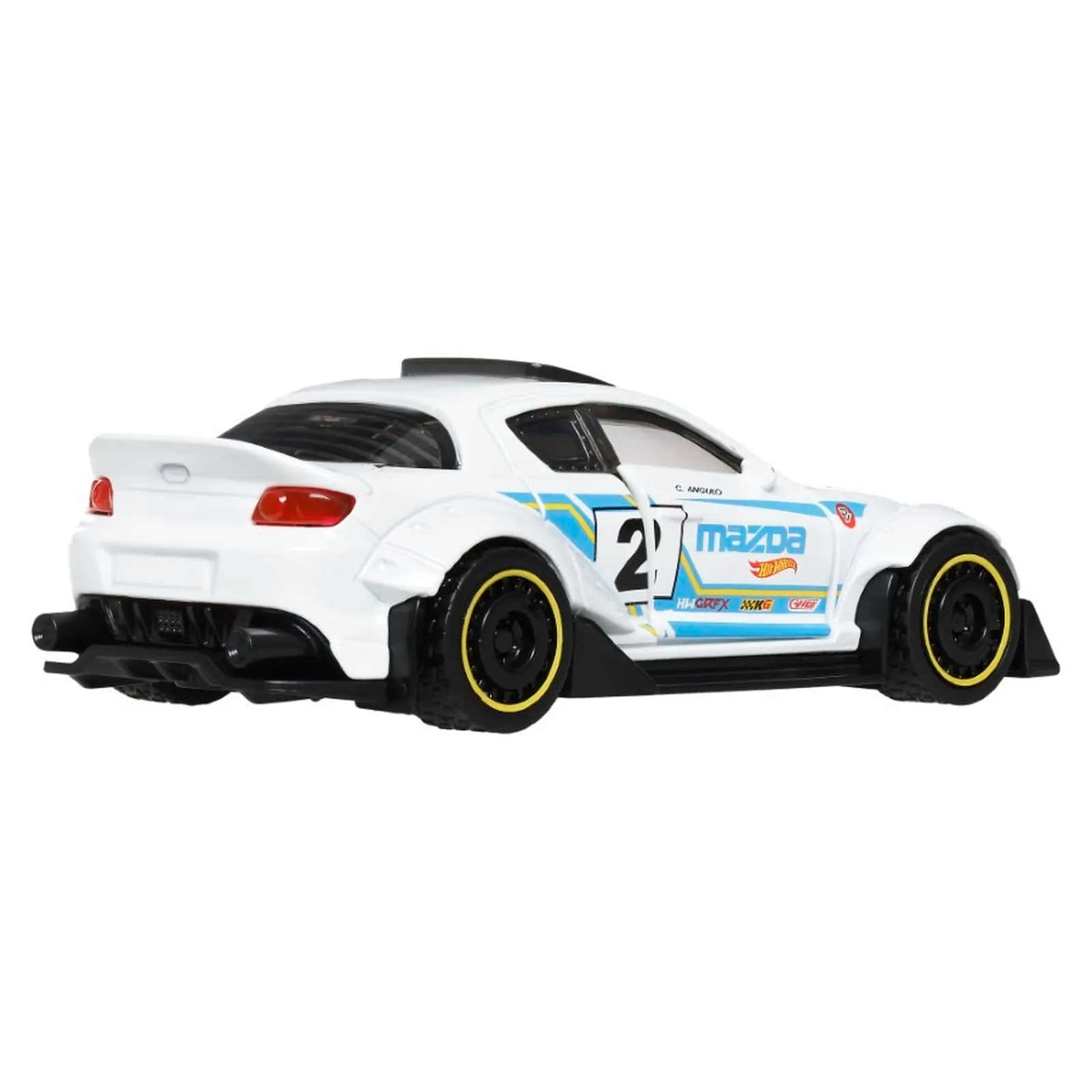 Model 2004 Mazda RX-8 Custom linii Hot Wheels to niezwykle szczegółowy pojazd w skali 1:43, który doskonale oddaje charakterystyki sportowego auta. Posiada niskie zawieszenie, białą karoserię oraz otwierane drzwi, co czyni go prawdziwą perełką kolekcjonerską. Należy do nowej serii Speeders i został wyposażony w napęd typu pull-back. Dzięki specjalnym sprężynom w tylnych kołach, wystarczy pociągnąć go do tyłu, by mógł przejechać ponad trzy metry.