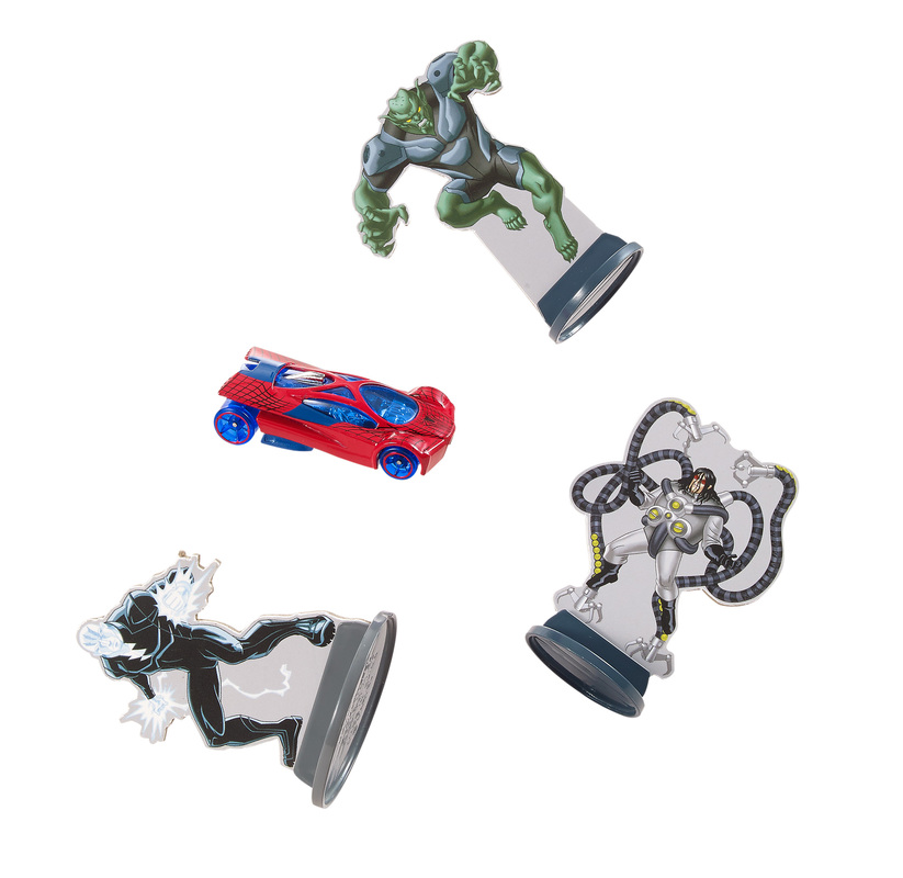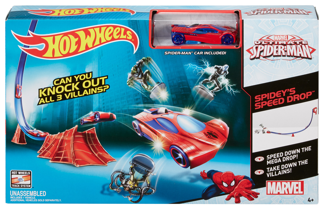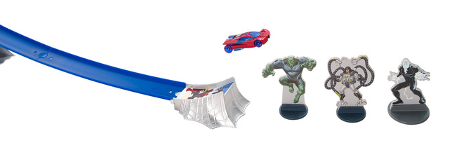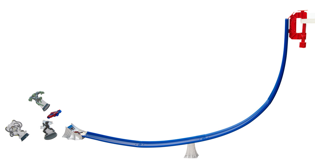 Przymocuj zacisk toru grawitacyjnego do blatu stołu i puść w dół dołączony samochód Hot Wheels SpiderMana, przejedź przez pajęczą skocznię wysokich prędkości i uderz w Zielonego Goblina, Doktora Octopusa oraz Elektro, zanim narobią jeszcze więcej kłopotów!