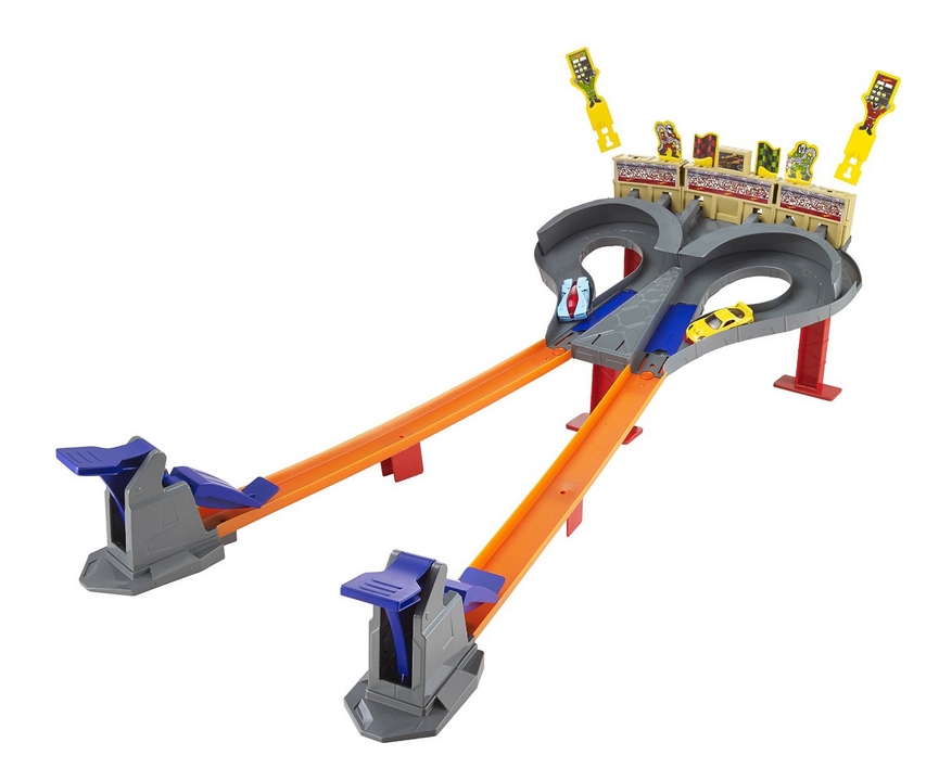 Tor wyścigowy na 2 samochodziki aktywowane przyciskami wyrzutni. Zwycięzcę nagradza flaga,a kolejne okrążenie sygnalizują znaki. Tory można łączyć z innymi zestawami Hot Wheels.
