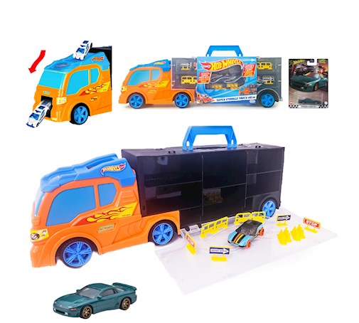 Transporter Hot Wheels jest dla chłopców zafascynowanych szybkimi samochodami, ta pomarańczowo-czarna ciężarówka pozwoli trzymać swoją całą kolekcję samochodzików Hot Wheels. Transporter posiada wbudowaną rampę, która dostarczy emocjonujących wrażeń. W zestawie znajdziesz znaki drogowe, która urozmaicą zabawę. Ta ciężarówka zachwyci każdego małego fana motoryzacji.
