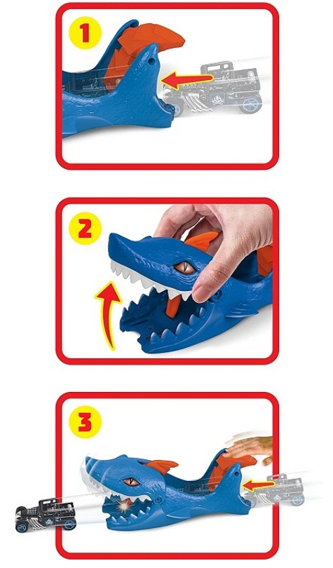 Niewielkich rozmiarów wyrzutnia z rekinem Hot Wheels zapewni frajdę i świetną zabawę wszystkich małym miłośnikom motoryzacji. Wyrzutnia wyglądem przypomina rekina ze szczęką pełną ostrych zębów. zacznijmy zabawę! Umieść autko w wyrzutni, naciśnij przycisk i zobacz, jak szybko wydostaje się na zewnątrz!