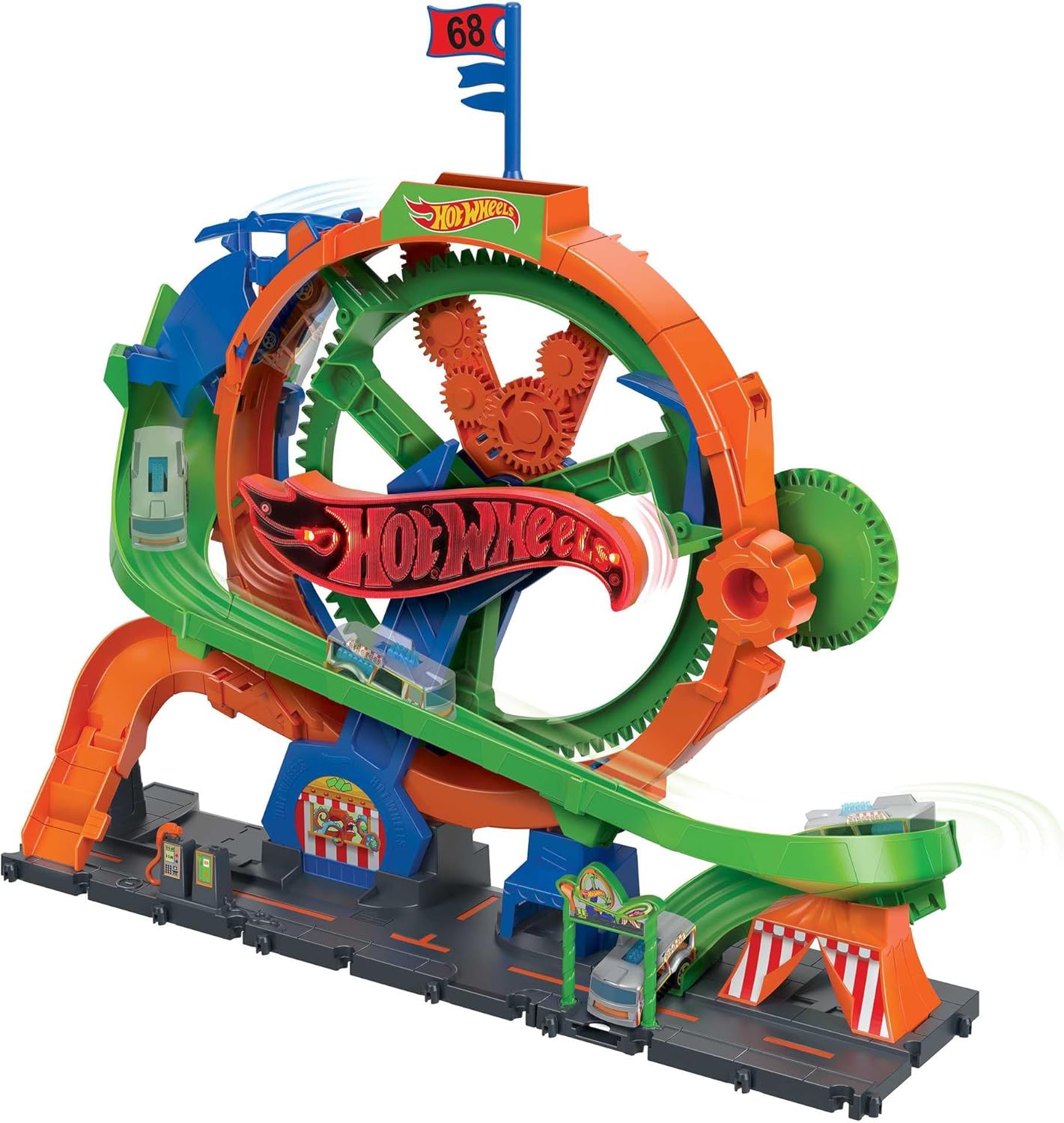 Dzięki zestawowi do zabawy Hot Wheels City, który zapewnia światła i dźwięki jak w kościele lub w parku rozrywki, można go obrócić. Podnieś rampę i przekręć kółko, aby wprawić w ruch. Automatycznie podnosi samochód i utrzymuje go, dopóki dziecko nie obróci flagi, aby ponownie wpuścić samochód na tor. W zestawie 1 samochodzik Hot Wheels, ale na diabelskim młynie mogą jeździć maksymalnie trzy jednocześnie.