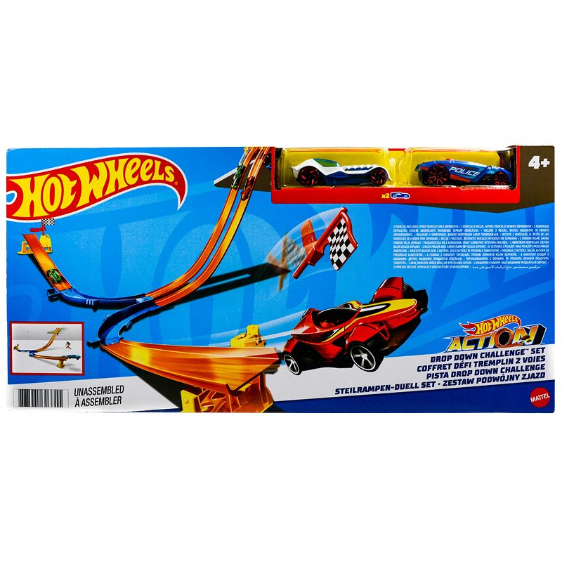 Niezapomniana przygoda czeka na Ciebie z ekscytującym torem wyścigowymi Hot Wheels Podwójny zjazd. Zmierz się z przyjaciółmi i pokonajcie stromy zjazd dwoma autkami jednocześnie. Przymocuj tor do krawędzi stołu, ustaw pojazdy na linii startu i podnieś bramkę - pojazdy wjadą w ostre zakręty, a dla zwycięzcy wystrzeli chorągiewka sygnalizująca przekroczenie mety. Sprawdź, który z nich okaże się szybszy!
