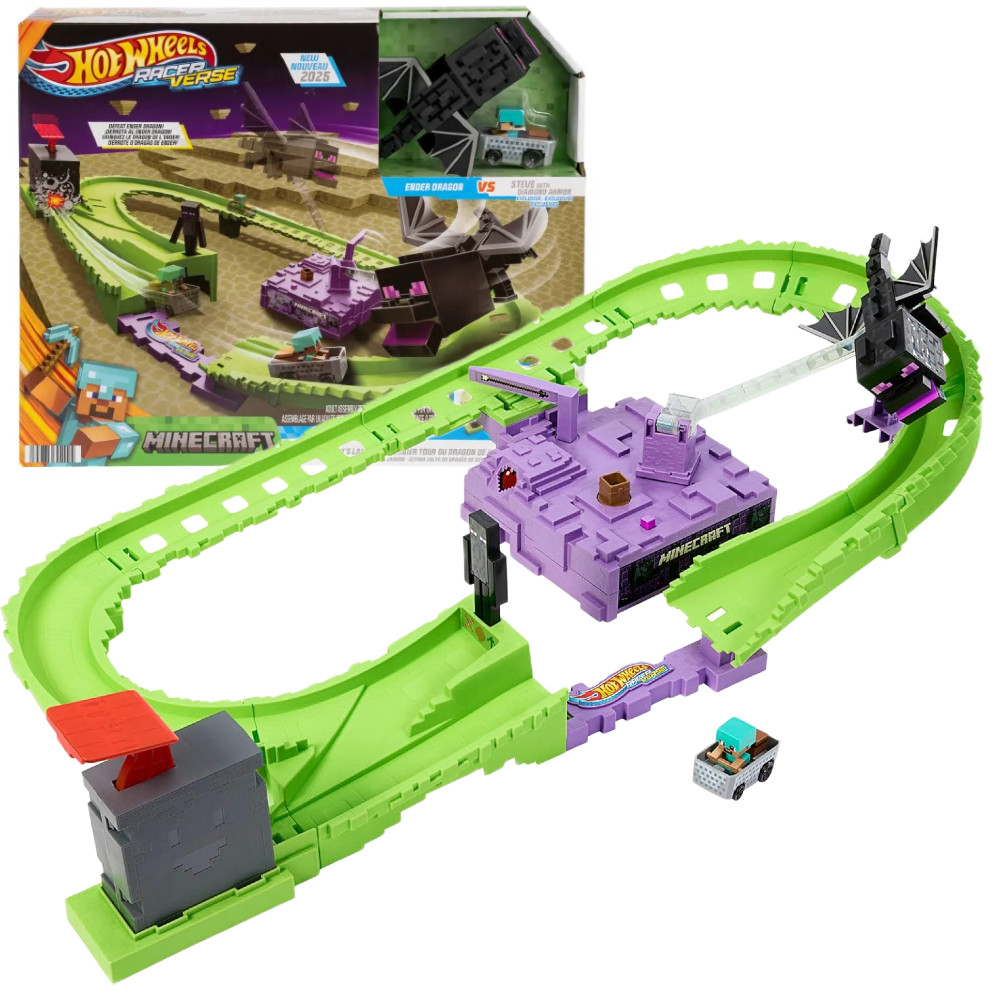 Wkrocz do finałowego, kultowego poziomu gry Minecraft wraz z Hot Wheels RacerVerse Diamond Armor Steve i pokonaj wirującego, przerażającego Ender Dragon! Nakręć wroga i wystrzel Steve'a w jego wagoniku w odpowiednim momencie, aby wykonał skok i wyścig, unikając wypadnięcia z toru. Każde ukończone okrążenie obniża pasek zdrowia wroga, a po pokonaniu go po sześciu okrążeniach Ender Dragon przewraca się.