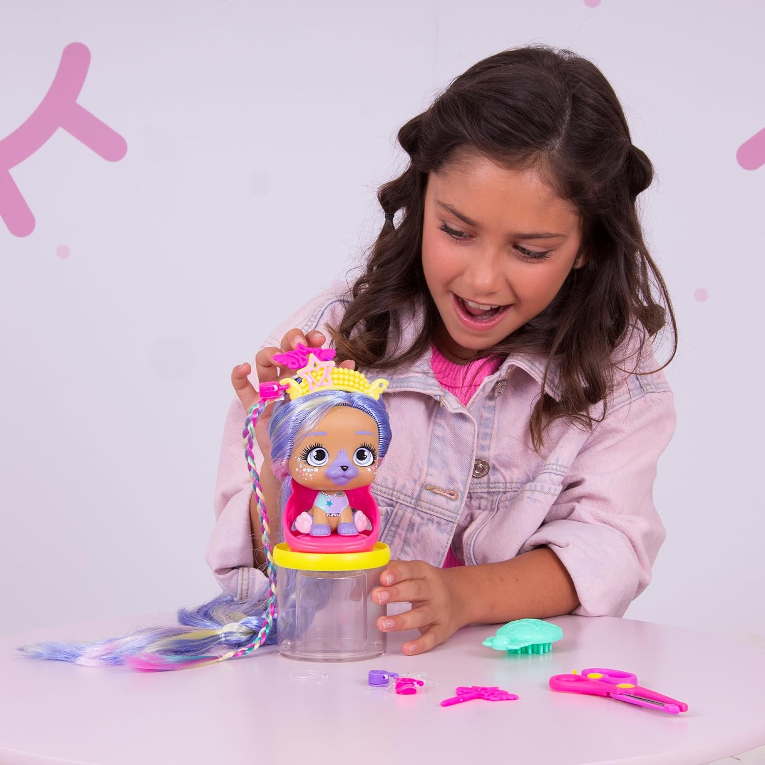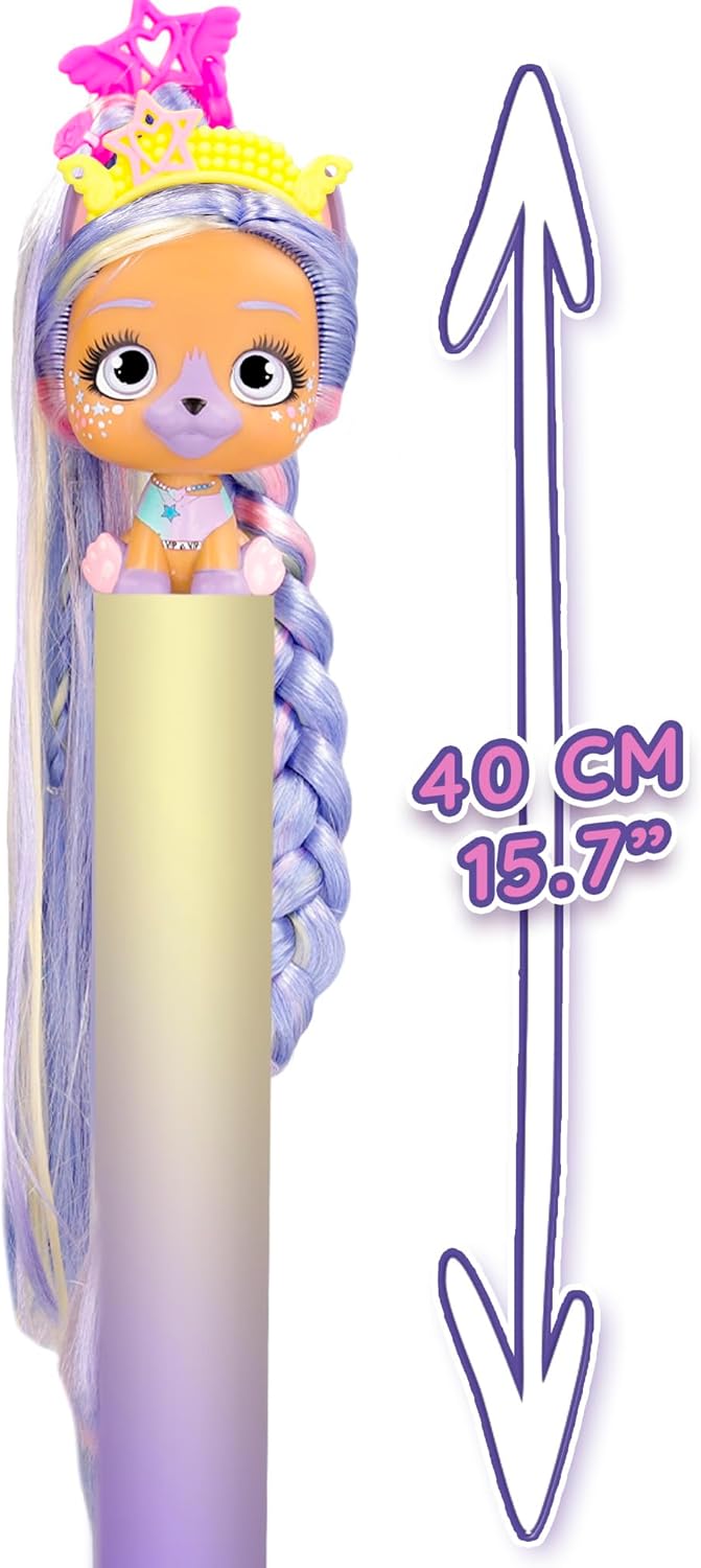 VIP Pets Hair Academy Miley to uroczy piesek z długimi, kolorowymi włosami XXL (do 40 cm), Jest to idealna zabawka dla małych fryzjerów i stylistów, w której można tworzyć fantastyczne fryzury i stylizację. Rozpuść jej 40 centymetrowe włosy, a znajdziesz pudełeczko z niespodziankami, które pozwolą nadać Miley odlotowego wyglądu Dzięki temu zestawowi dzieci mogą wcielić się w rolę fryzjera, tworząc unikalne fryzury, przycinając włosy oraz doczepiając kolorowe pasma. Dzięki VIP Pets Hair Academy dzieci mogą rozwijać swoją kreatywność i poczuć się jak prawdziwi fryzjerzy!Wyjątkowe cechy produktu: