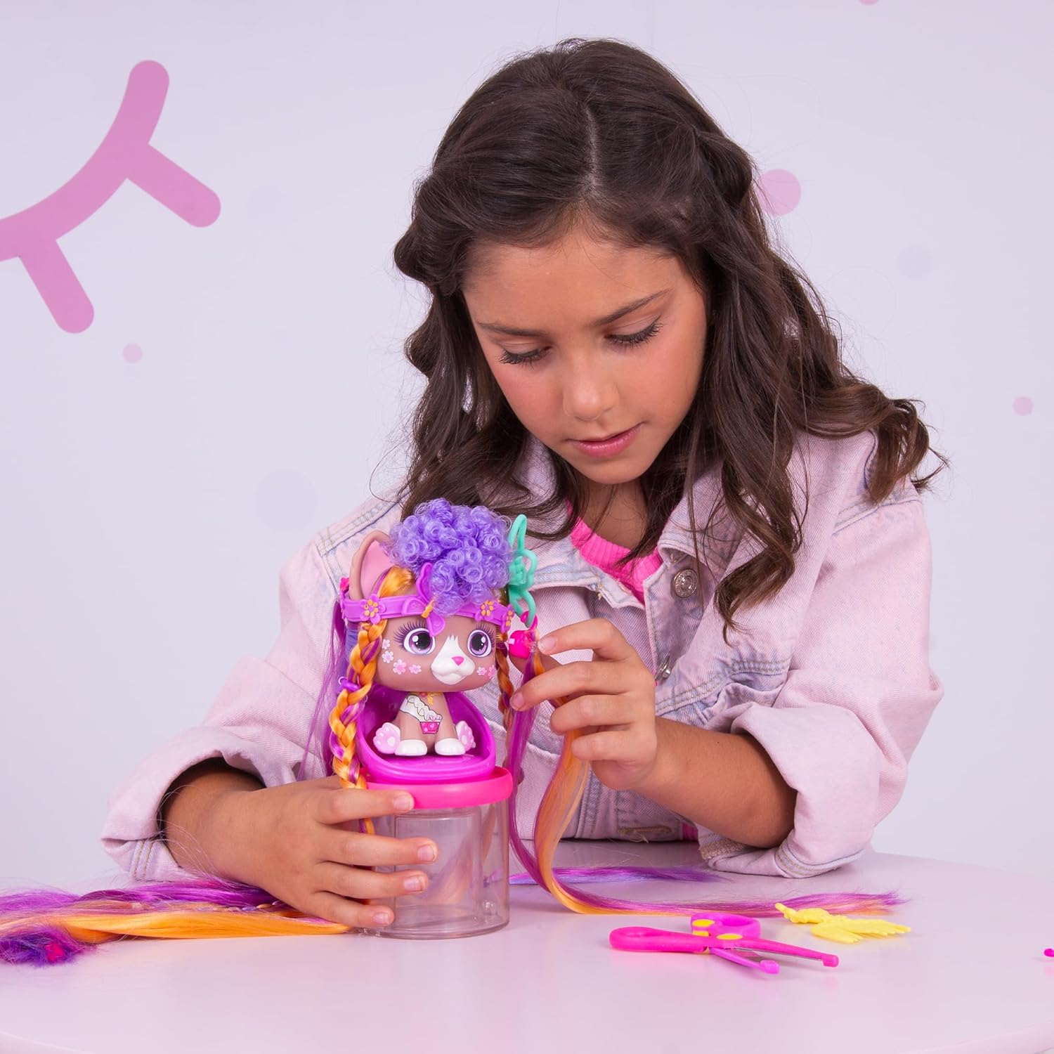 VIP Pets Hair Academy Nyla to uroczy piesek z długimi, kolorowymi włosami XXL (do 40 cm), Jest to idealna zabawka dla małych fryzjerów i stylistów, w której można tworzyć fantastyczne fryzury i stylizację. Rozpuść jej 40 centymetrowe włosy, a znajdziesz pudełeczko z niespodziankami, które pozwolą nadać Nyla odlotowego wyglądu Dzięki temu zestawowi dzieci mogą wcielić się w rolę fryzjera, tworząc unikalne fryzury, przycinając włosy oraz doczepiając kolorowe pasma. Dzięki VIP Pets Hair Academy dzieci mogą rozwijać swoją kreatywność i poczuć się jak prawdziwi fryzjerzy!Wyjątkowe cechy produktu: