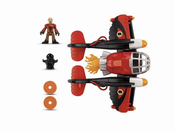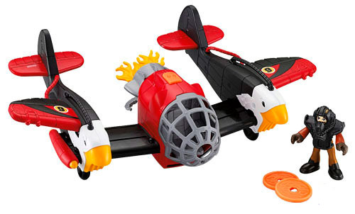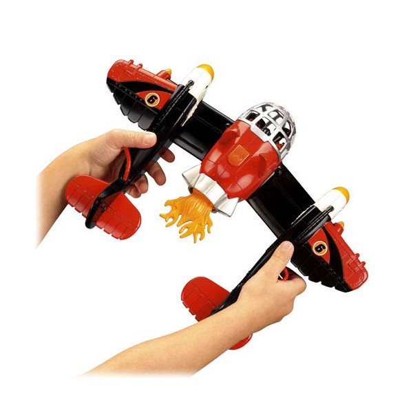 Imaginext Duży Samolot Orzeł X5251 Czerwony samolot Orzeł ma dwa silniki odrzutowe stylizowane na orły. Oba silniki posiadają wyrzutnię dysków. Posiada również hak do którego można przyczepić trawę. Skrzydła mogą się schować, a po naciśnięciu przycisku ponownie rozłożyć. Otwierany kokpit mieści figurkę pilota.