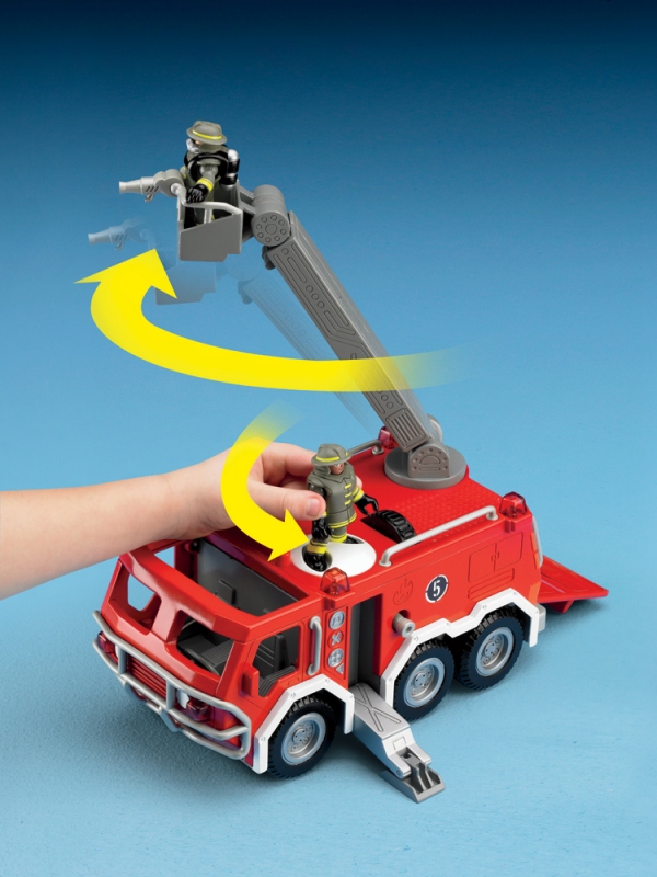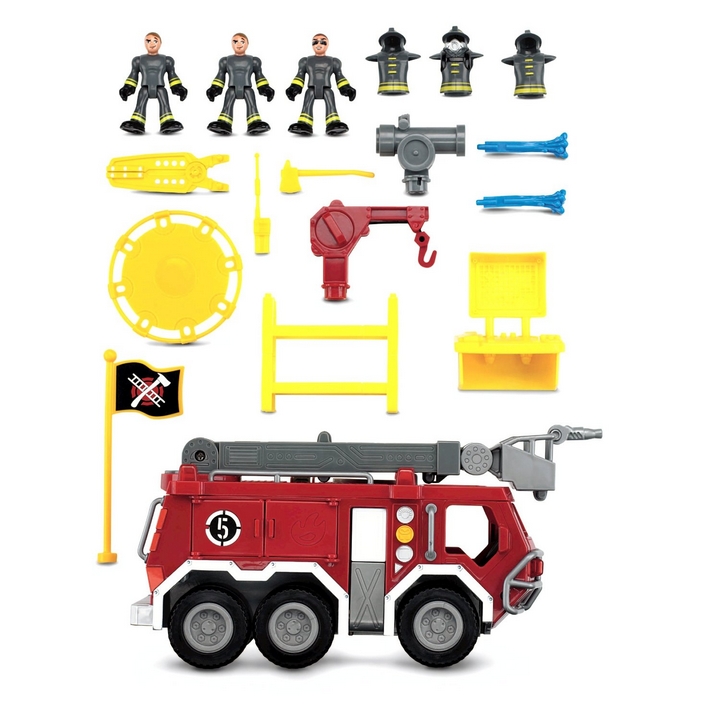 Wóz straży pożarnej świeci światłami i wydaje dźwięki, ma podnoszoną, wyciąganą drabinę, wyciągany wąż, a ustawiając figurkę w punkcie aktywacji, uruchomisz specjalną funkcję! Wysuń podpory i podnośnik z koszem. Wyciągnij wąż, gaś pożar armatką wodną. Dasz radę opanować ogień, czy musisz dzwonić po drugą ekipę? To będzie nowa przygoda za każdym razem, gdy się bawisz.