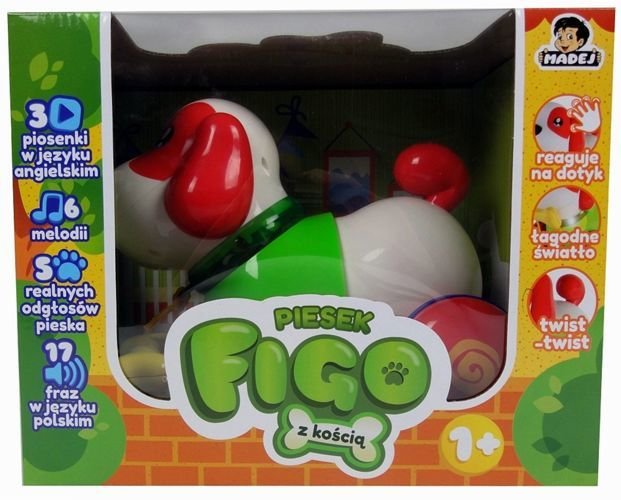 Interaktywny piesek Figo to wspaniały przyjaciel każdego malucha. Figo śpiewa w języku angieskim, wypowiada frazy w języku polskim oraz wydaje odgłosy prawdziwego pieska. Reaguje na dotyk, macha ogonkiem oraz podczas zabawy świeci mu obroża. Kiedy już dziecko pozna Figo nie będzie chciało się z nim rozstać.