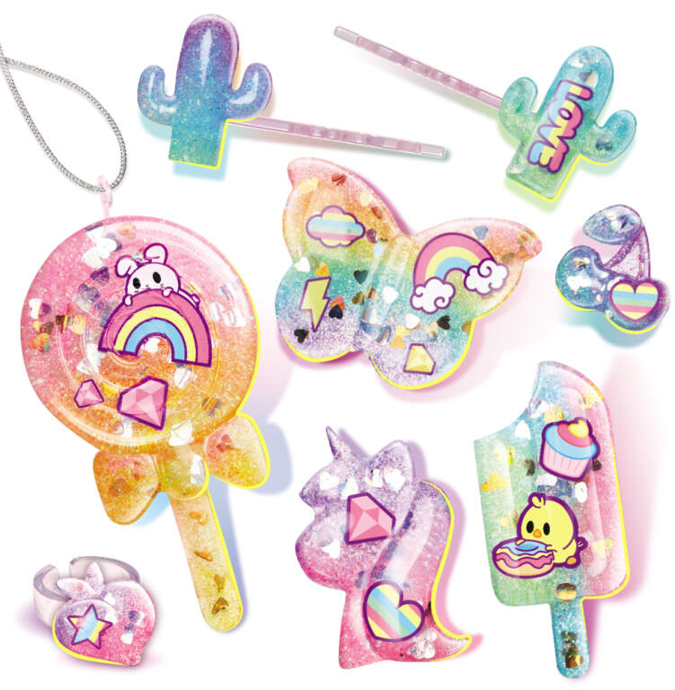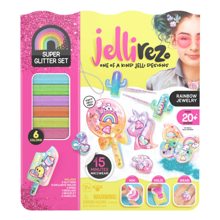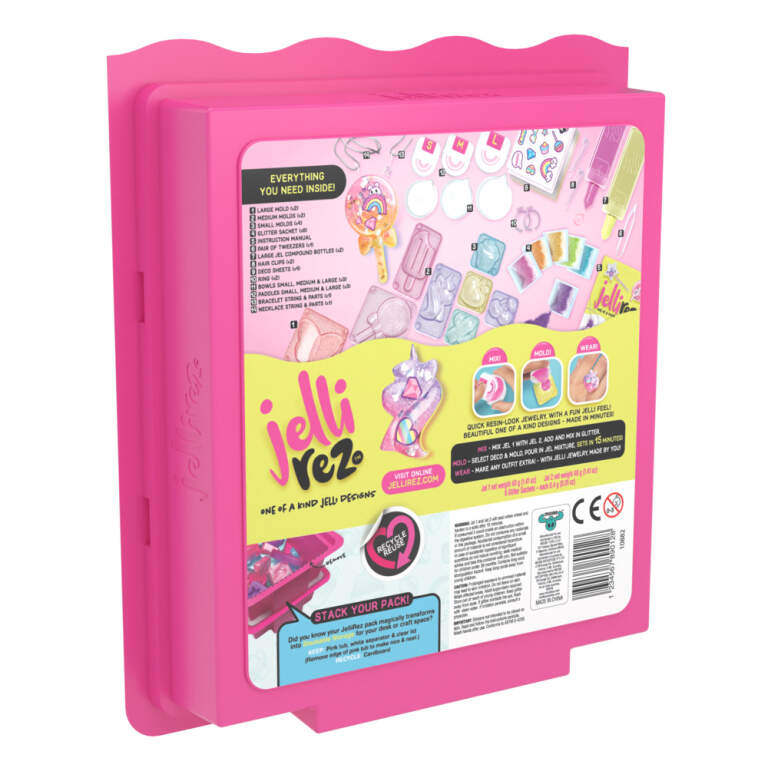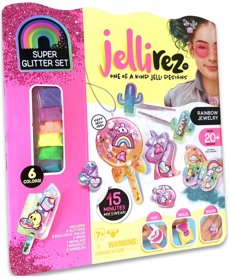 Jelli Rez pozwala tworzyć jedyne w swoim rodzaju projekty biżuterii przy użyciu żelu i łatwego 3-etapowego procesu, który zajmuje tylko 15 minut - po prostu wymieszaj, uformuj i załóż! Jelli Rez wysycha powietrzem naturalnie i bezpiecznie. Zestaw kreatora zawiera wszystko, czego potrzebujesz, aby stworzyć ponad 20 unikalnych projektów. Idealny zestaw dla dziewcząt będących w podróży, z miejscem do przechowywania w jednym kompaktowym, przenośnym opakowaniu. Wzory form: lizak, lód na patyku, jednorożec, motyl, babeczka, brzoskwinia, kaktus i wiśnie. Zestaw zawiera również 6 błyszczących brokatowych kolorów, w tym: fioletowy, różowy, pomarańczowy, żółty, zielony i niebieski - dzięki czemu możesz zrobić projekty we wszystkich kolorach tęczy! Twórz pierścionki, naszyjnik, bransoletkę i spinki do włosów, które możesz nosić lub obdarować swoich przyjaciół!