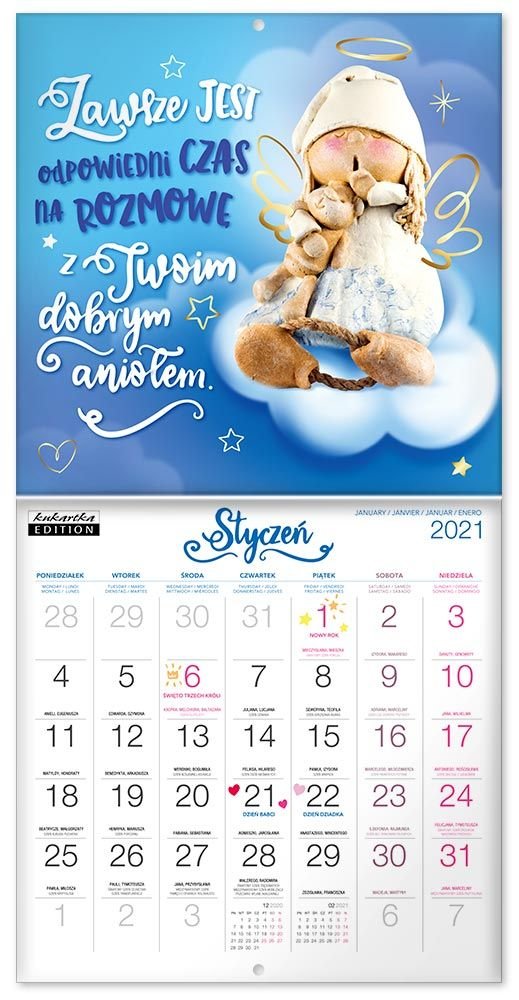 Kwadratowy kalendarz ścienny z aniołkami, Każdy miesiąc ukazuje zdjęcie aniołka i cytat na kążdy miesiąc, który będzie wspaniałą ozdobą na ścianie. Kalendarz po rozłożeniu na wymiary 30 x 60 cm.