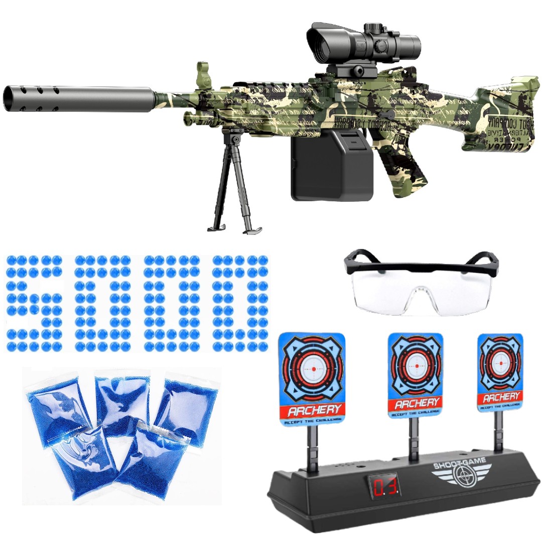 Karabin na kulki żelowe automatyczny moro z kwadratowym magazynkiem M249 + okulary + tarcza elektroniczna