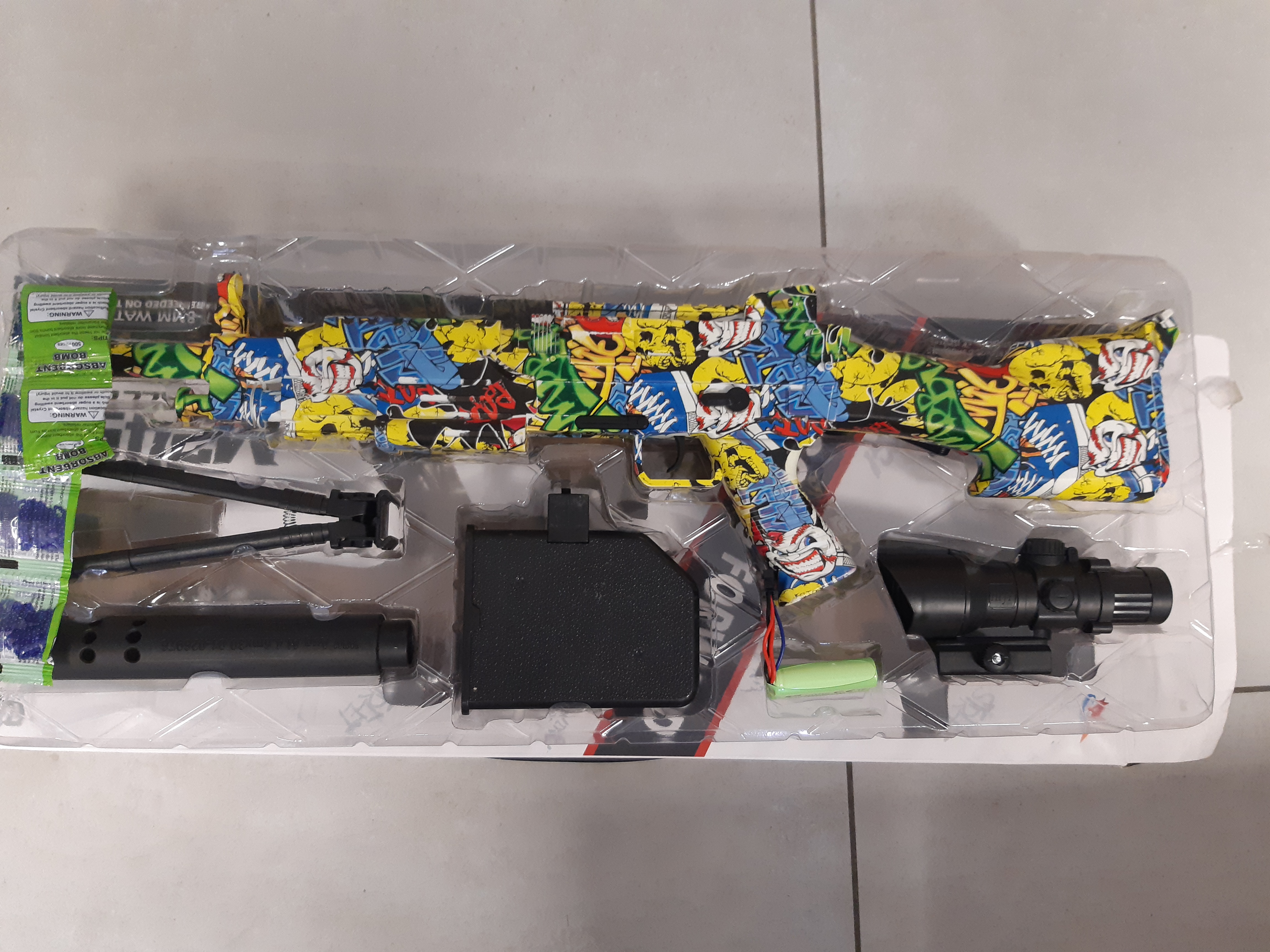 Karabin na kulki żelowe wykonany jest z wytrzymałego tworzywa ABS, który jest odporny na wgniecenia, przetarcia i zarysowania, co pozwala na utrzymanie wyrzutni w idealnym stanie wizualnym. Lekki i solidnie wykonany karabin wyposażony jest w napęd automatyczny, co pozwala na strzelanie ogniem ciągłym po naciśnięciu języka spustowego. Co ciekawe wyrzutnia jest także przeładowywana ręcznie - z boku wyrzutni znajduje się uchwyt do przeładowania. W zestawie z wyrzutnią znajdziemy magazynek, celownik, dwójnóg oraz długą lufę. Przygotuj kulki żelowe według instrukcji, napełnij magazynek i stań do walki!