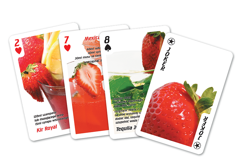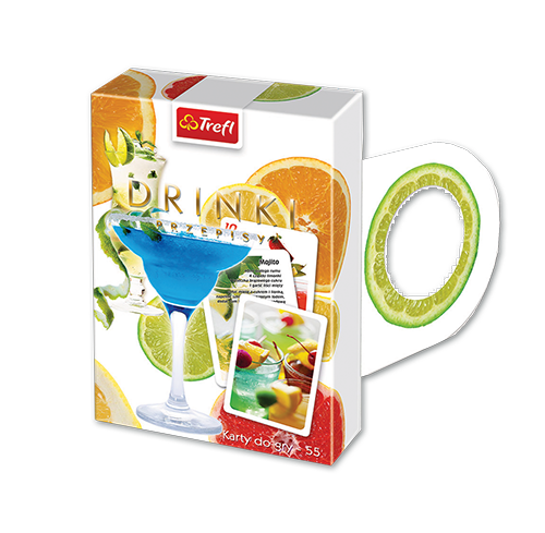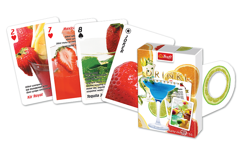 Karty "Drinki" to tradycyjna talia do gry w nowym, wyjątkowym wydaniu. Każda karta oprócz klasycznych oznaczeń, zawiera inny przepis na pyszny, imprezowy koktajl. Przygotowanie "Kir Royal" czy "Mojito" od tej pory nie będzie stanowiło już żadnego problemu.
