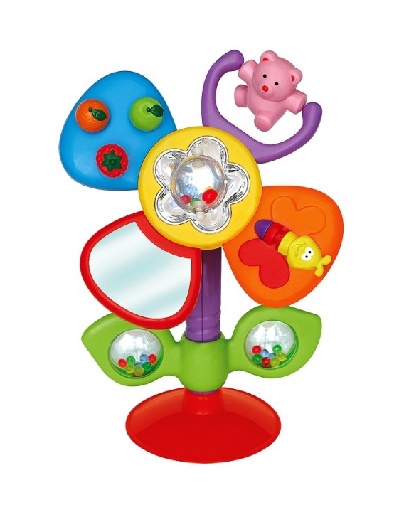 Pomiędzy płatkami jest kuleczka, w środku której są kolorowe koraliki, gdy będziemy kręcić kuleczką będą wydawały grzechoczący dźwięk tak samo jak w listku, który znajduje się poniżej. Listek dodatkowo kręci się dookoła łodyżki. Kwiatek posiada przyssawkę, możemy postawić go przed dzieckiem i umilić mu chwilę, w której musi posiedzieć jakiś czas w jednym miejscu.