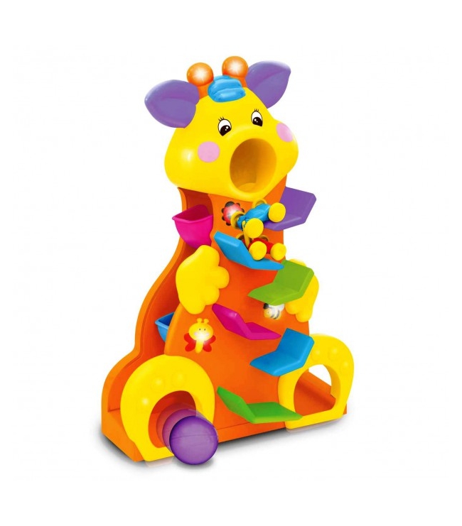 Magiczna żyrafka to śliczna kolorowa zjeżdżalnia w kształcie żyrafy zapewni dziecku zabawę na długi czas. Gdy dziecko wrzuci kulki przez buźkę żyrafki rozbłysną kolorowe światełka i usłyszy wesołe dźwięki. Z przodu żyrafki znajduje się kolorowa droga, po której mogą zjeżdżać magiczne samochodziki.