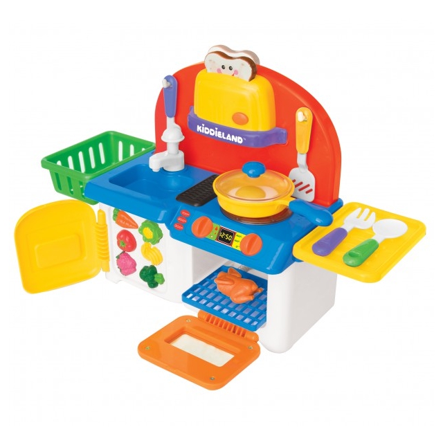 Kiddieland Mała Kuchareczka przeznaczona jest dla każdego maluszka który lubi gotować. W małej kuchni znajdziemy zlew z kranem wydającym dźwięk cieknącej wody , otwierając lodówkę dziecko zobaczy 6 różnych owoców i warzyw które po naciśnięciu nagrodzą dziecko dźwiękiem, z tostera ze śmiesznym trzaskiem wyskakuje wesoły tościk, palnik i ruszt świecą się oraz wydają dźwięki gotowania. Na blacie leżą nóż i widelec które zachęcą malca do korzystania ze sztućców w życiu codziennym.