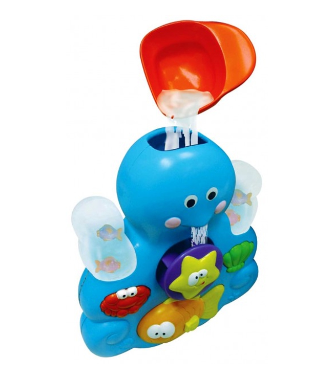 Wesoła ośmiornica Kiddieland dostarczy dzieciom mnóstwo zabawy podczas odkrywczych kąpieli. Dziecko może wlewać wodę do ośmiorniczki za pomocą małej czerwonej czapeczki i widzieć jak woda przepływa w dół poruszając gwiazdkę. Naciskając krabika lub muszelkę może wpompować powietrze do wody co wprawia w ruch kolorowe koraliki, poruszając płetwą rybka będzie tryskać pyszczkiem wodą na zewnątrz.