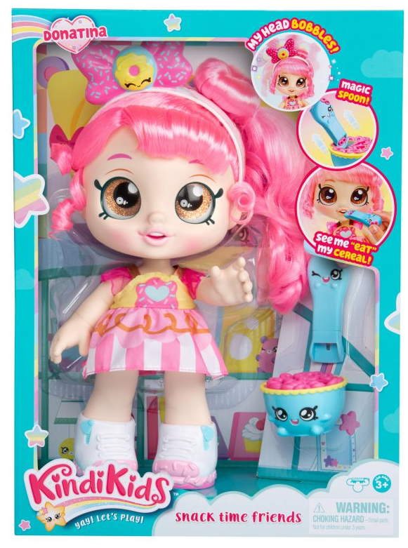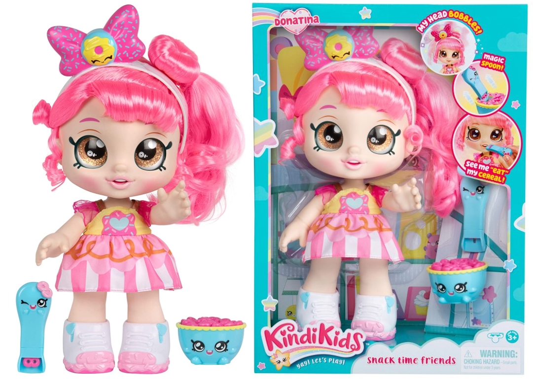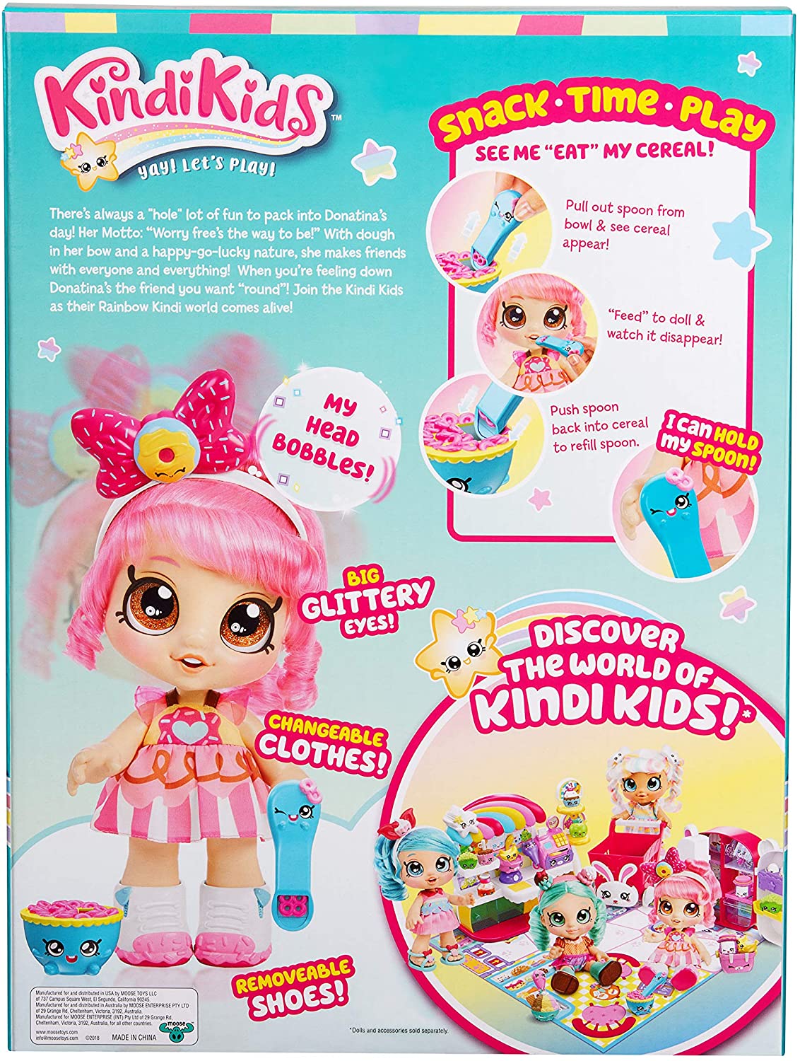 Lalka Donatina ma różowe włosy oraz opaskę z kokardkowym donutem. Na źrenicach jej dużych złotych oczu "odbija" się obraz małego donuta. Lalka ma zdejmowaną kolorową sukienkę i buty. W zestawie znajdują się dwa interaktywne akcesoria-miseczka z płatkami i magiczna łyżeczka. Kiedy wyjmiesz łyżeczkę i przyłożysz ją do ust lalki, płatki "znikają". W całej kolekcji Kindi Kids znajdują się takie laleczki jak: Donatina, Rainbow Kate, Marsha Mello, Jessicake i Peppa Mint.