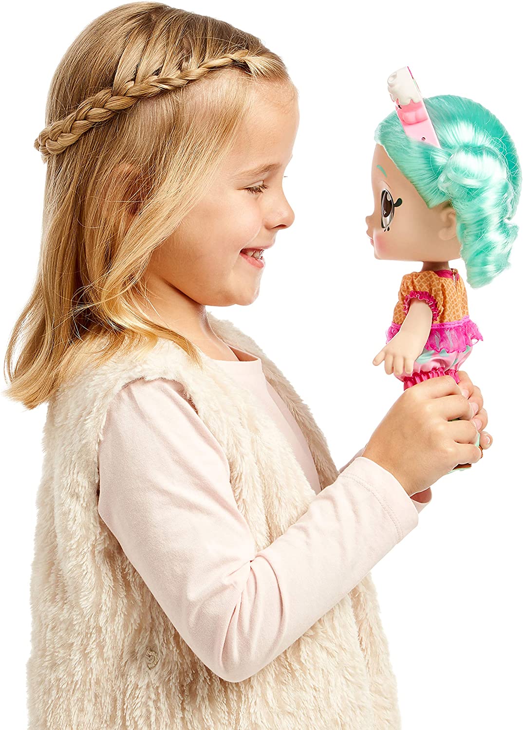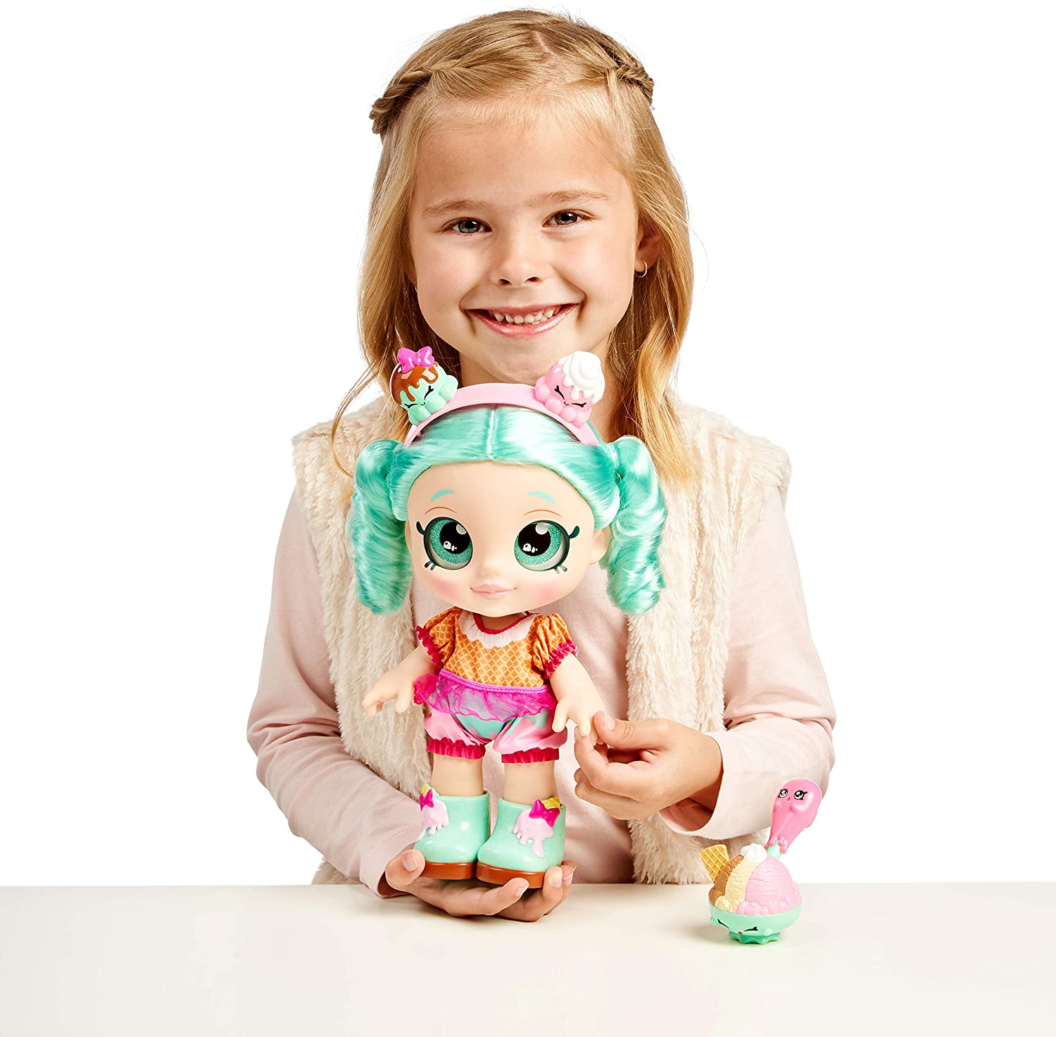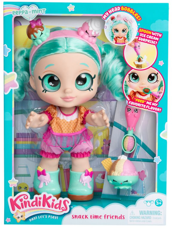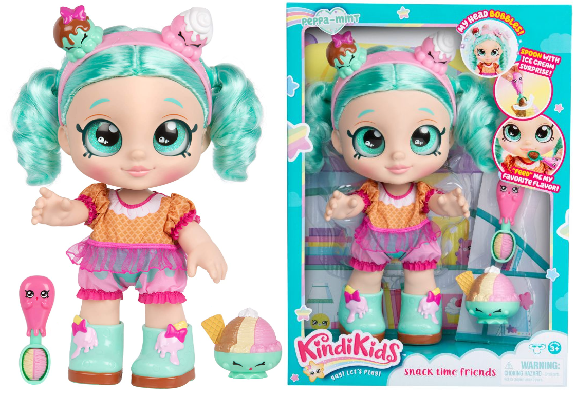 Kindi Kids to najsłodsze lalki, jakie kiedykolwiek widziałeś. Urocze laleczki lalki mają piękne kolorowe włosy oraz cudowne duże kolorowe błyszczące oczy. Laleczki potrafią kiwać głową. Kindi Kids mają kolorowe zdejmowane ubranka oraz buciki. Każda lalka ma w zestawie inne przekąski.