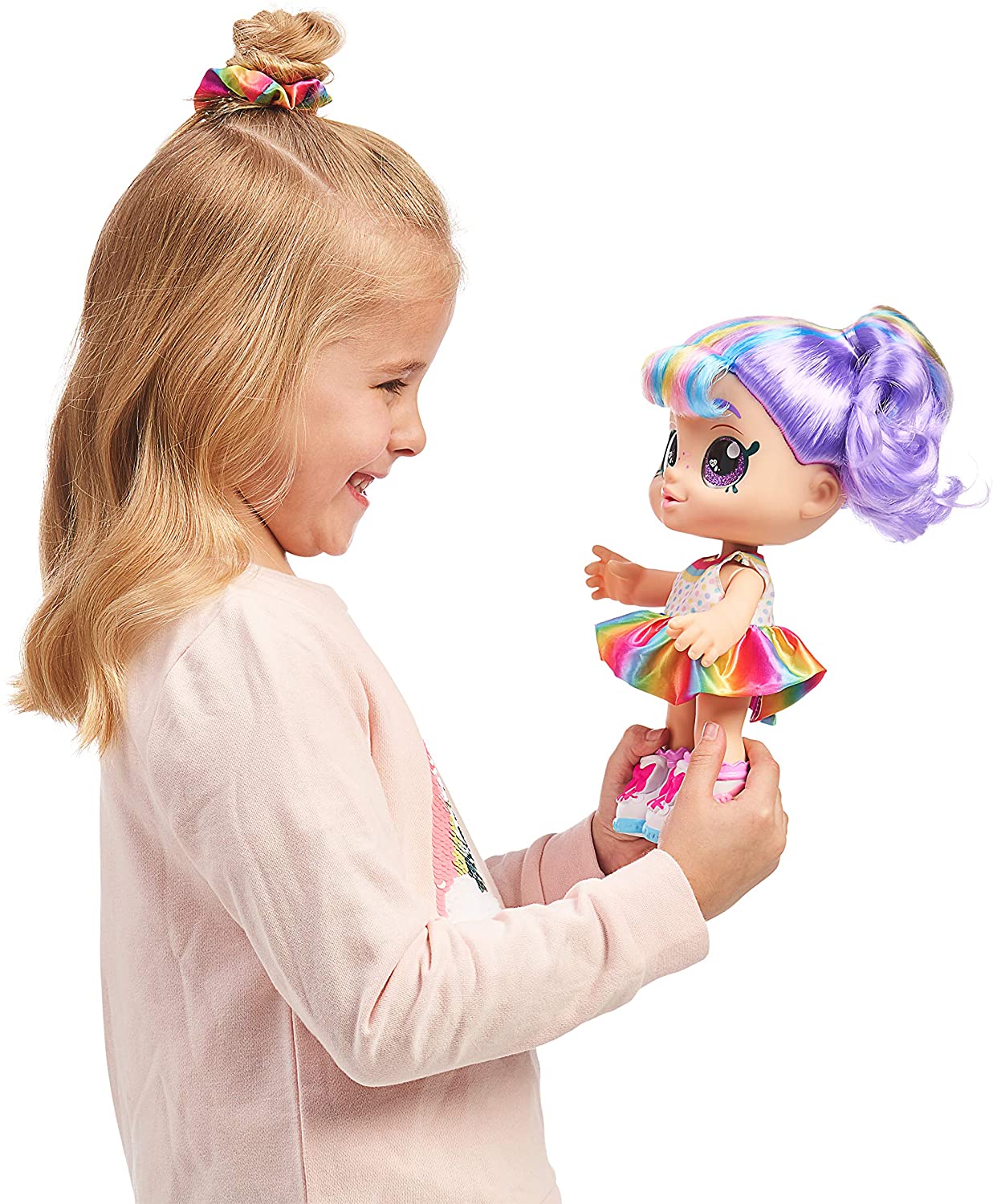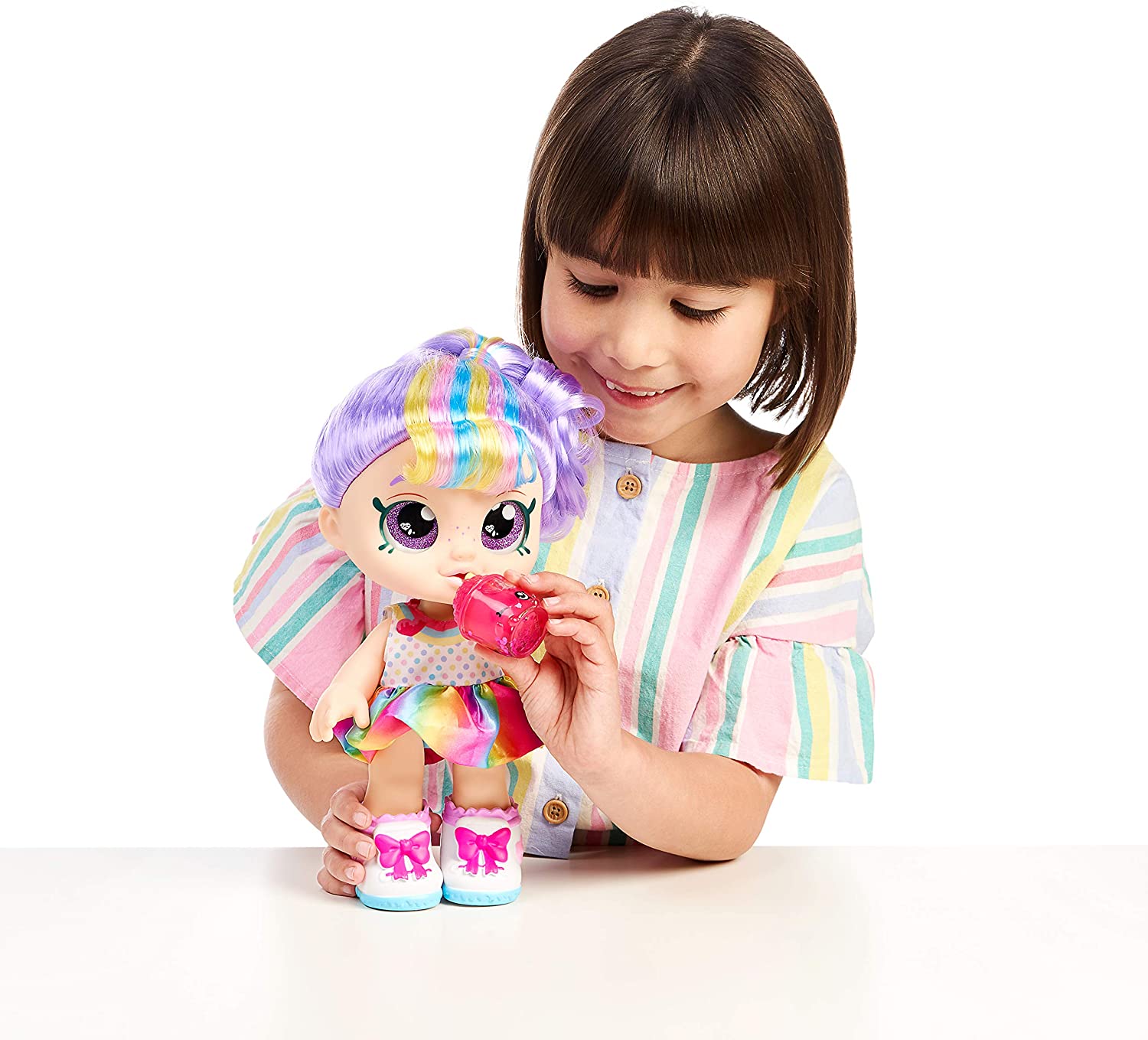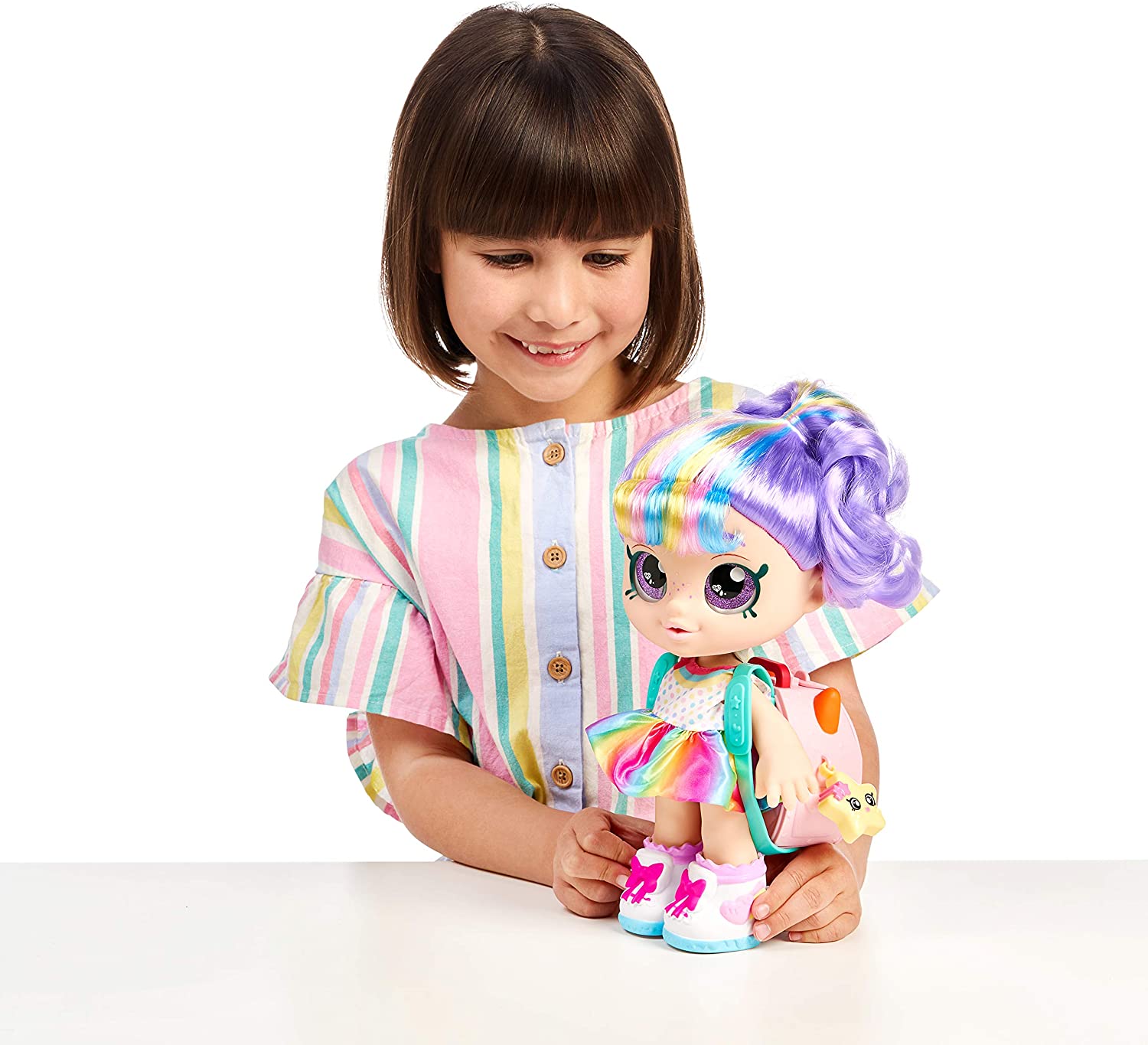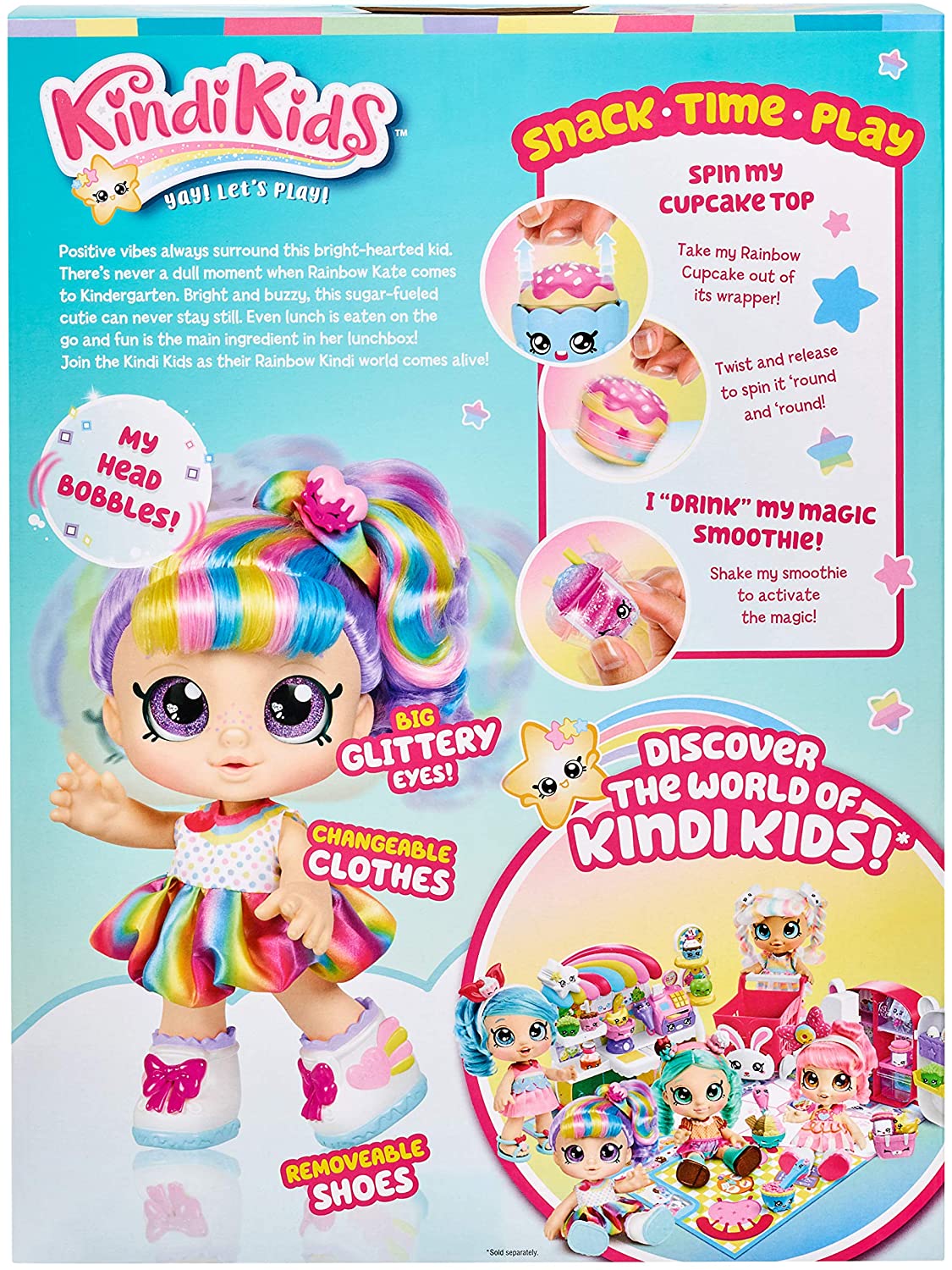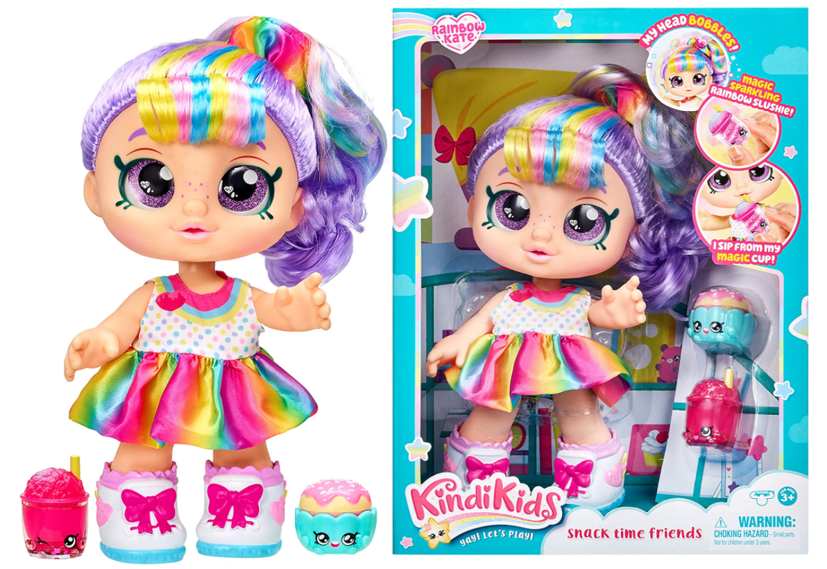 Lalka Rainbow Kate ma fioletowe włosy z kolorowymi pasemkami spięte w koński ogon tęczową gumką z lukrowaną truskawką. Na źrenicach jej dużych fioletowych oczu "odbija" się obraz małej babeczki w kształcie serca. Lalka ma zdejmowaną kolorową sukienkę i buty. W zestawie znajdują się dwa interaktywne akcesoria-smakowe lodowe slushie i tęczowa babeczka. Kiedy wyjmiesz tęczową babeczkę z opakowania, zobaczysz jak się obraca. Kiedy potrząśniesz błyszczącym tęczowym lodem slushie, aktywujesz jego magię. W całej kolekcji Kindi Kids znajdują się takie laleczki jak: Donatina, Rainbow Kate, Marsha Mello, Jessicake i Peppa Mint.