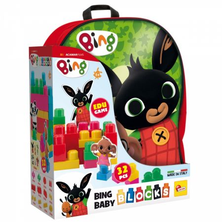 W zestawie znajdują klocki konstrukcyjne i kartoniki z podobizną głównych bohaterów bajki Bing. Klocki dzieci mogą nosić w plecaczku z motywami z bajki.