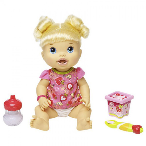 Lalka Baby Alive Łakomczuszek to doskonała zabawka dla małej mamy. Nakarm ją specjalnym jogurtem owocowym z jej kubeczka i obserwuj jak znika. Czas na więcej? Ponownie włóż łyżeczkę do jogurtu i obserwuj jak jogurt znów się “pojawia”. W zestawie butelka ze “znikającym” mlekiem. Mówi po polsku, ma mięciutkie włosy i jest w opakowaniu z funkcja “Try-Me”.