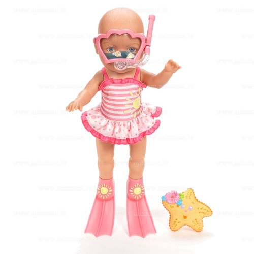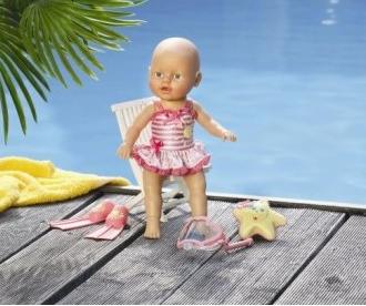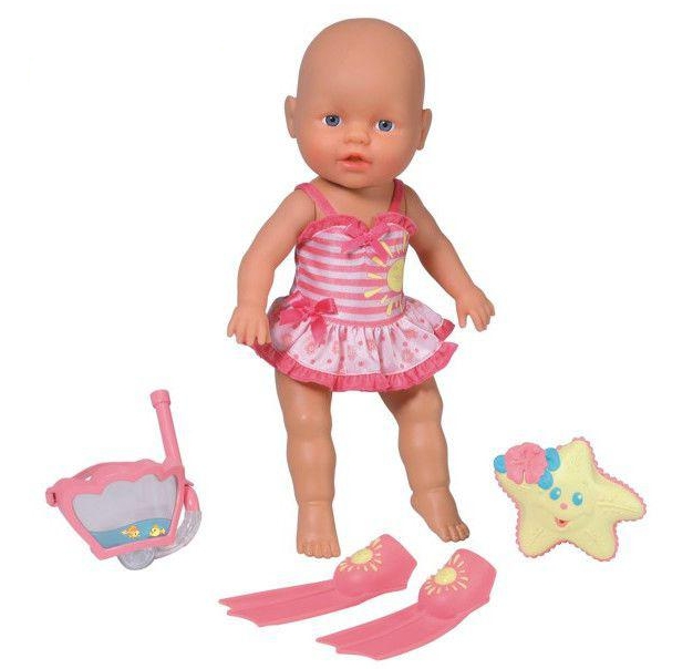 Gdy zanurzysz małą Baby Born w wodzie, wówczas lalka zacznie automatycznie poruszać rączkami i nogami, dzięki czemu z łatwością utrzymuje się na powierzchni wody i naprawdę pływa. Laleczka ubrana jest w uroczy różowy kostium w paseczki z falbanką imitującą spódniczkę, posiada płetwy z motywem słoneczka, maskę z rurką i zabawną żółtą rozgwiazdę, która piszczy i tryska wodą. Gdy założysz laleczce maskę, wówczas po zanurzeniu w wodzie mała Baby Born zacznie wypuszczać bąbelki.