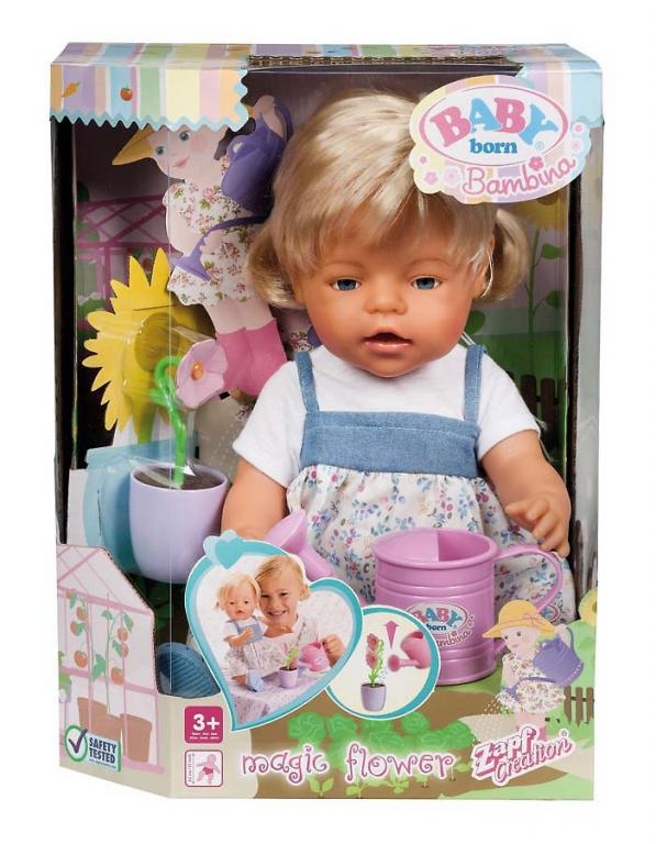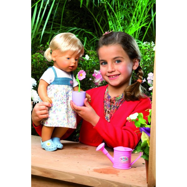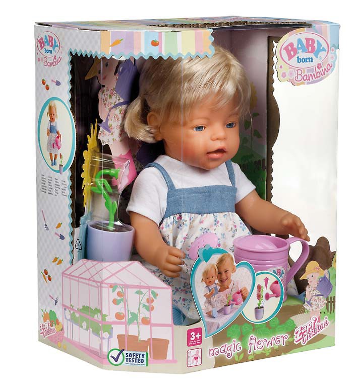 Mała ogrodniczka Bambina ma kwiatuszka, który magicznie rośnie, gdy się go podlewa z konewki. Lalka ubrana jest w urocze wiosenne ubranko: t-shirt i sukieneczkę, ma też modne, gumowe buciki. Lalka ma urocze blond włosy do zabawy w układanie fryzur, funkcję picia i moczenia się.