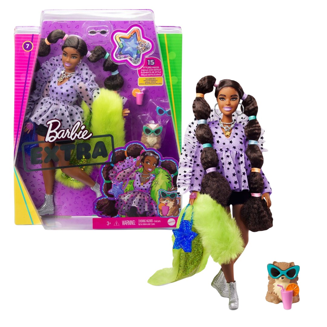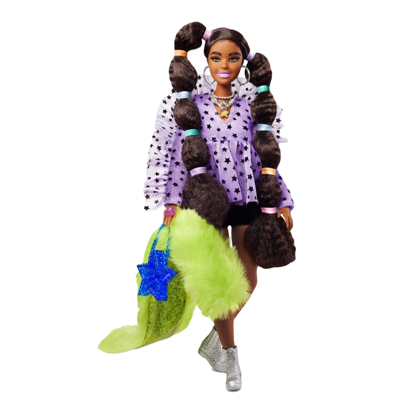 Lalka pochodzi z serii Fashionistas Extra, w której Barbie mają ekstrawagancki, unikalny wygląd. Nasza Barbie to ciemnoskóra piękność o bujnych długich włosach splecionych w dwa okazałe warkocze. Lalka Barbie jest bardzo modna, ubrana jest w modny zestaw z tuniką w gwiazdki, krótkie spodenki oraz zielone boa. Dopełnienie stylizacji stanowią oryginalne dodatki: torebka, srebrne kolczyki oraz buty, okulary, a to wszystko z motywem gwiazdki. W zestawie znajduje się także nieodłączny towarzysz Barbie - uroczy jeżyk w okularach oraz z napojem. Łącznie w zestawie znajduje się ponad 10 akcesoriów.