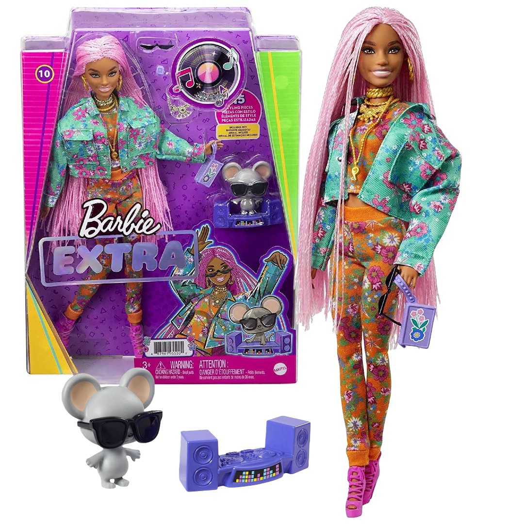 Lalka pochodzi z serii Fashionistas Extra, w której Barbie mają ekstrawagancki, unikalny wygląd. Nasza Barbie ma cudowne długie jasnoróżowe włosy splecione w wiele małych warkoczyków. Lalka Barbie jest bardzo modna, ubrana jest bardzo kolorowo i ze smakiem. Ma na sobie zieloną wzorzystą kurtkę oraz pomarańczowe spodnie i top z kwiatowym wzorem pasującym do kurtki. Dopełnienie stylizacji stanowią oryginalne dodatki: torebka, złote kolczyki oraz buty, okulary i inne. W zestawie znajduje się także nieodłączny towarzysz Barbie - urocza myszka z zestawem muzycznym. Łącznie w zestawie znajduje się ponad 10 akcesoriów.
