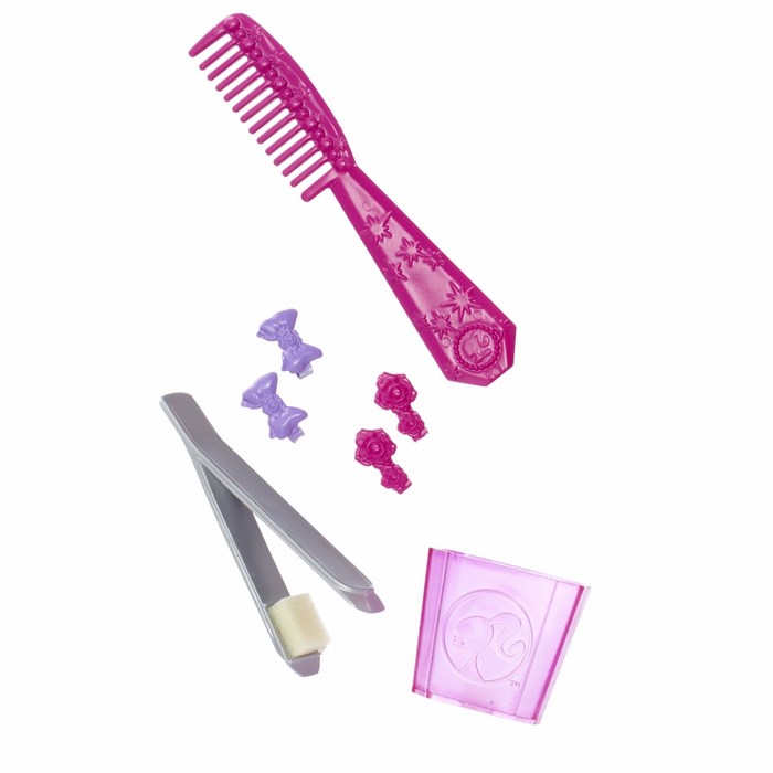 W tworzeniu przepięknych fryzur pomogą dołączone akcesoria fryzjerskie — różowe i fioletowe spinki, jedna srebrzysta opaska na włosy i różowy grzebień.