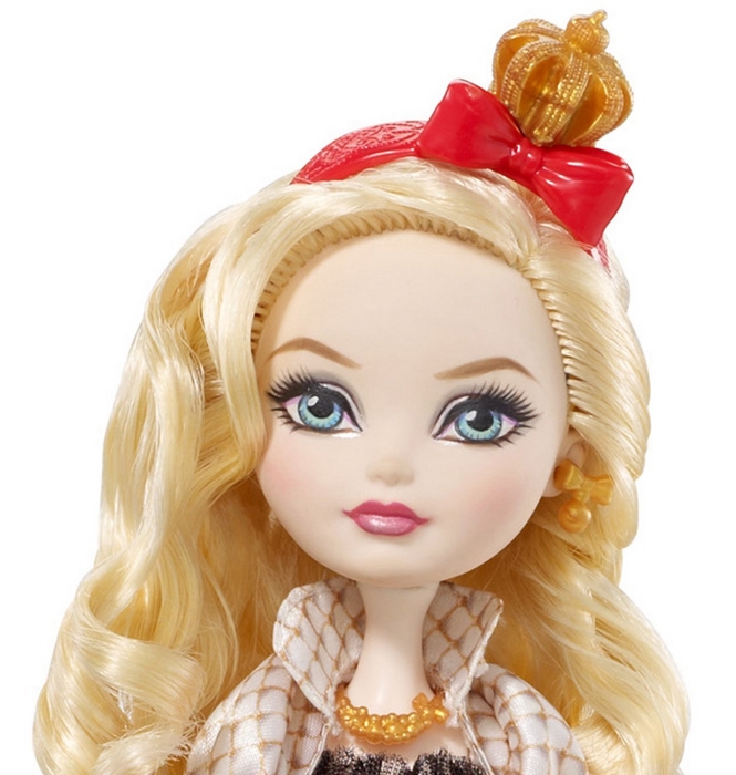 Apple White to córka Królewny Śnieżki, która czeka na otrucie jabłkiem, aby po wszystkim zostać wybudzoną przez przystojnego królewicza. Lalka ubrana jest w czerwoną sukienkę, ze złotymi wzorkami na dole, na nogach ma wysokie buty w kształcie jabłka oraz wiele świecących dodatków w postaci złotej biżuterii. Na głowie Apple White znajduje się czerwona opaska z kokardą i koroną, a w ręku trzyma torebkę w kształcie jabłka.