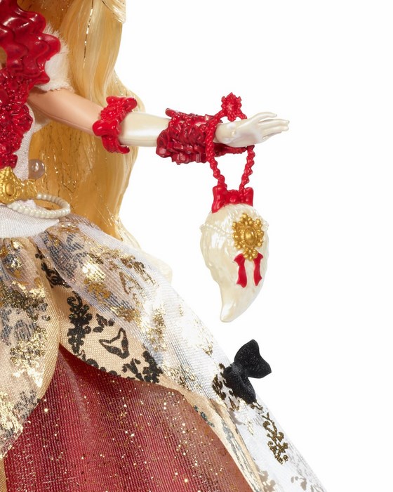 Apple White jest córką Królewny Śnieżki z bajki o siedmiu krasnoludkach. To najpopularniejsza i najbardziej lubiana uczennica w całym liceum Ever After High. Bohaterka uparcie podąża za swoim przeznaczeniem, marzy o swoim Szczęśliwym Zakończeniu i życiu u boku wspaniałego księcia. Jest konsekwentna w przestrzeganiu tradycji a przy tym bardzo miła i koleżeńska. Lalka ubrana jest w suknię balową, która składa się aż z trzech warstw: czerwonej tafty, brokatowej siateczki oraz kremowej z czarnym, królewskim nadrukiem. Do lalki dołączona jest złota maska oraz biała torebka z czerwonymi wstążeczkami i złotą pieczęcią.