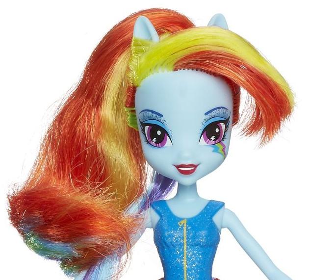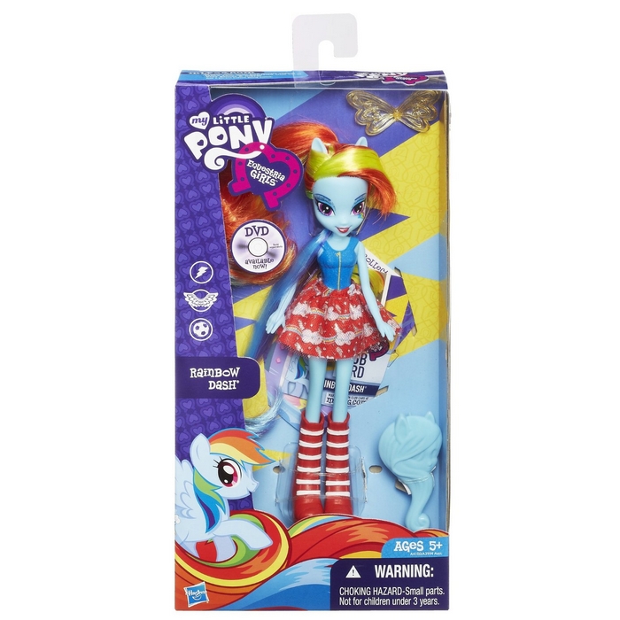 Każda lalka ma swój znaczek na policzku, nawiązujący do jej kucykowego alter ego. Ponadto ma zdejmowaną, modną spódniczkę i buty, charakterystyczne dla danej postaci - dziewczynki będą uwielbiały zamianę stylów pomiędzy swoimi ulubionymi postaciami. Rainbow Dash nosi się w sportowym stylu. Każda z My Little Pony Equestria Girls ma również kartę ucznia Canterlot High.