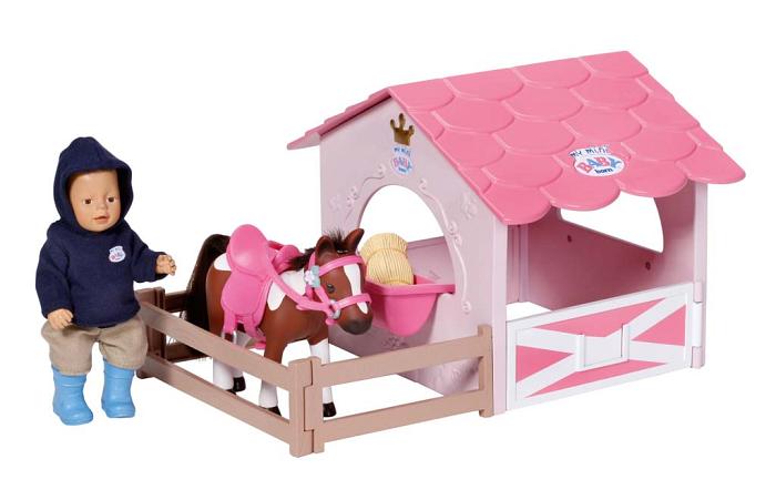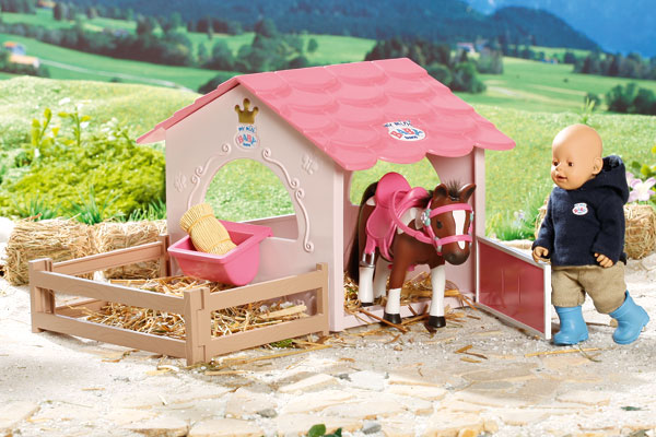 Baby Born uwielbia konie, dlatego każdą wolną chwilę spędza w stadninie. Laleczka nie tylko uwielbia jeździć konno, ale i również opiekować się swoimi pupilami. Karmi je, sprząta i dba o nie. Przy stajni znajduje się ogrodzony wybieg dla koni i poidło. Drzwi stajni otwierają się.