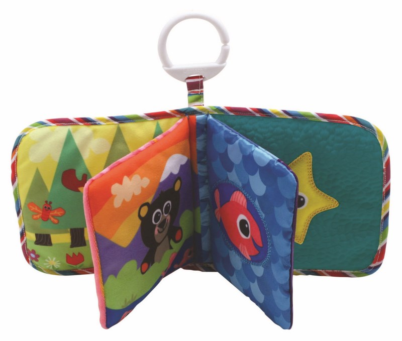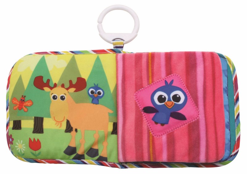 Mięciutka – książeczka zawieszka wykonana jest z wielu różnych tkanin, a na każdej stronie dziecko pozna nowego przyjaciela – łosia, niedźwiadka, rybkę, ptaszka, słoneczko oraz gwiazdkę.