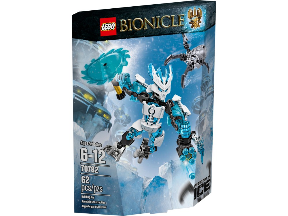 Niebezpieczeństwo! Pająk Zagłady wyskoczył z lodowej szczeliny i zaatakował Protektorów. Zamień intruza w bryłę lodu dzięki mocy żywiołów Lodowego Miotacza, z którego strzela Obrońca Lodu. Przeznaczeniem tego potężnego, lodowego wojownika o głowie i osłonie BIONICLE® są zajadłe bitwy, więc zakręć jego niezwykłą lodową piłą i załatw Pająka Zagłady, zanim zdoła zedrzeć maskę.