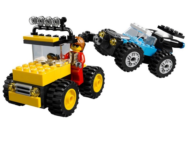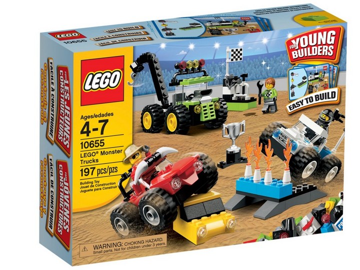 Monster Trucki 10655 rozpoczynają zawody! Czerwony wóz teksański współzawodniczy z niebieskim wozem policyjnym w mistrzostwach świata! Rozpędź się na płonącej rampie i przeskocz nad żółtym autem, aby zdobyć nagrodę! Jeśli dojdzie do awarii, na miejscu jest mechanik, gotowy podjechać swoją ciężarówką naprawczą wyposażonym w ruchomy podnośnik z hakiem i usunąć usterkę kluczem!