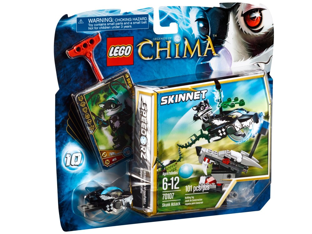 Zapuść się głęboko w krainę Chimy i pomóż Skinnetowi pokonać plemię Wilków w skunksowym Speedorze LEGO® Chima! Posadź Skinneta na skunksowym Speedorze, pociągnij linkę i uwolnij pojazd! Wyceluj w rampę, przeskocz nad wilkiem i traf w cel, by zdobyć CHI! Dołącz elementy dodatkowe, by zwiększyć stabilność!