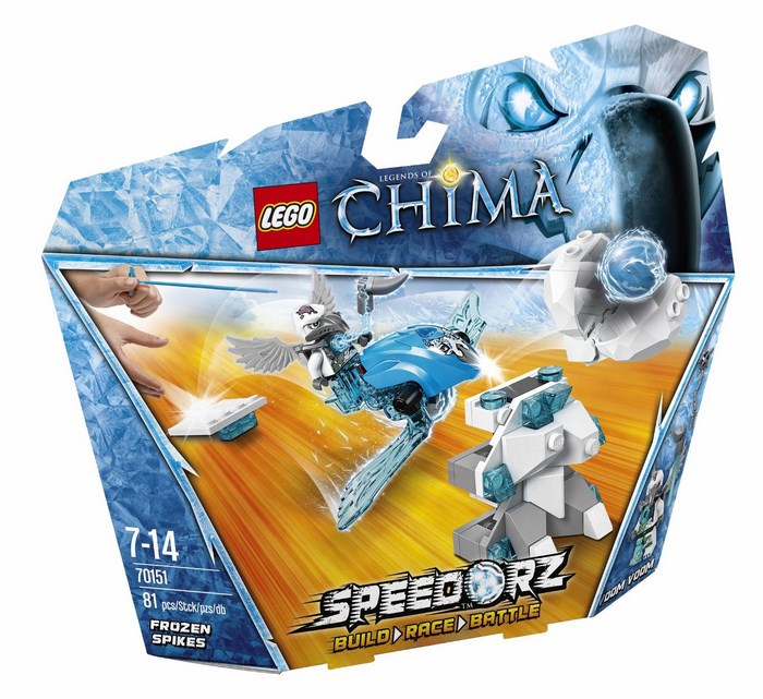 Wybierz się do magicznego królestwa Chima i pomóż Voom Voomowi znaleźć CHI, bawiąc się zestawem Lodowe kolce z serii LEGO® Legends of Chima™ Speedorz™! Posadź sępa na jego nowym Speedorze i pociągnij linkę, aby ruszyć z miejsca! Uderz w rampę, aby przewrócić lodową wieżę, rozbij lodową skałę i uwolnij ukryte CHI.